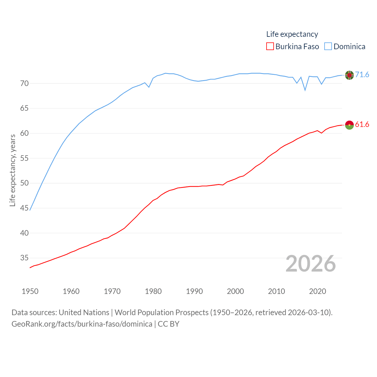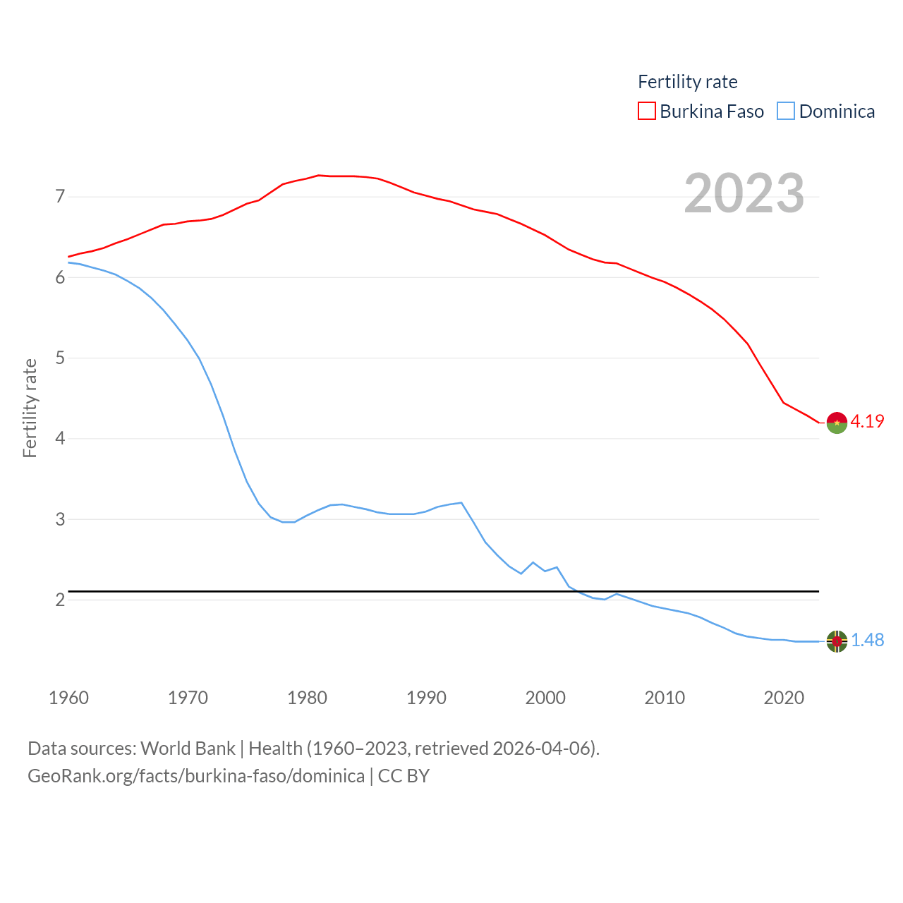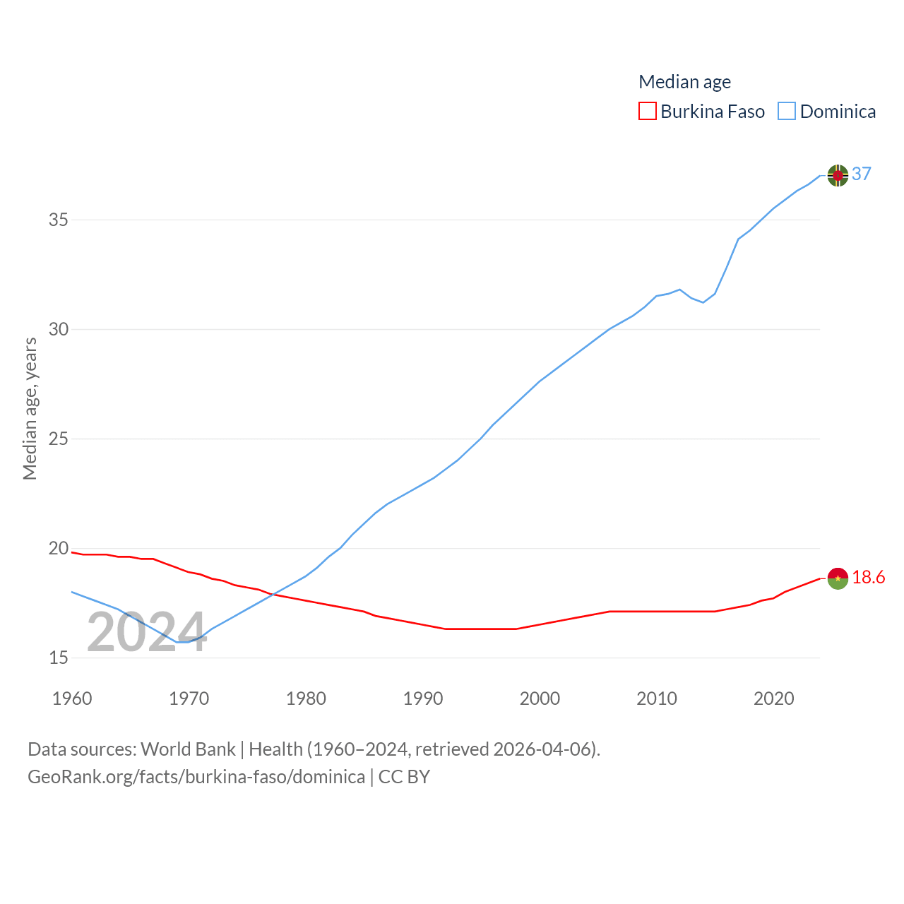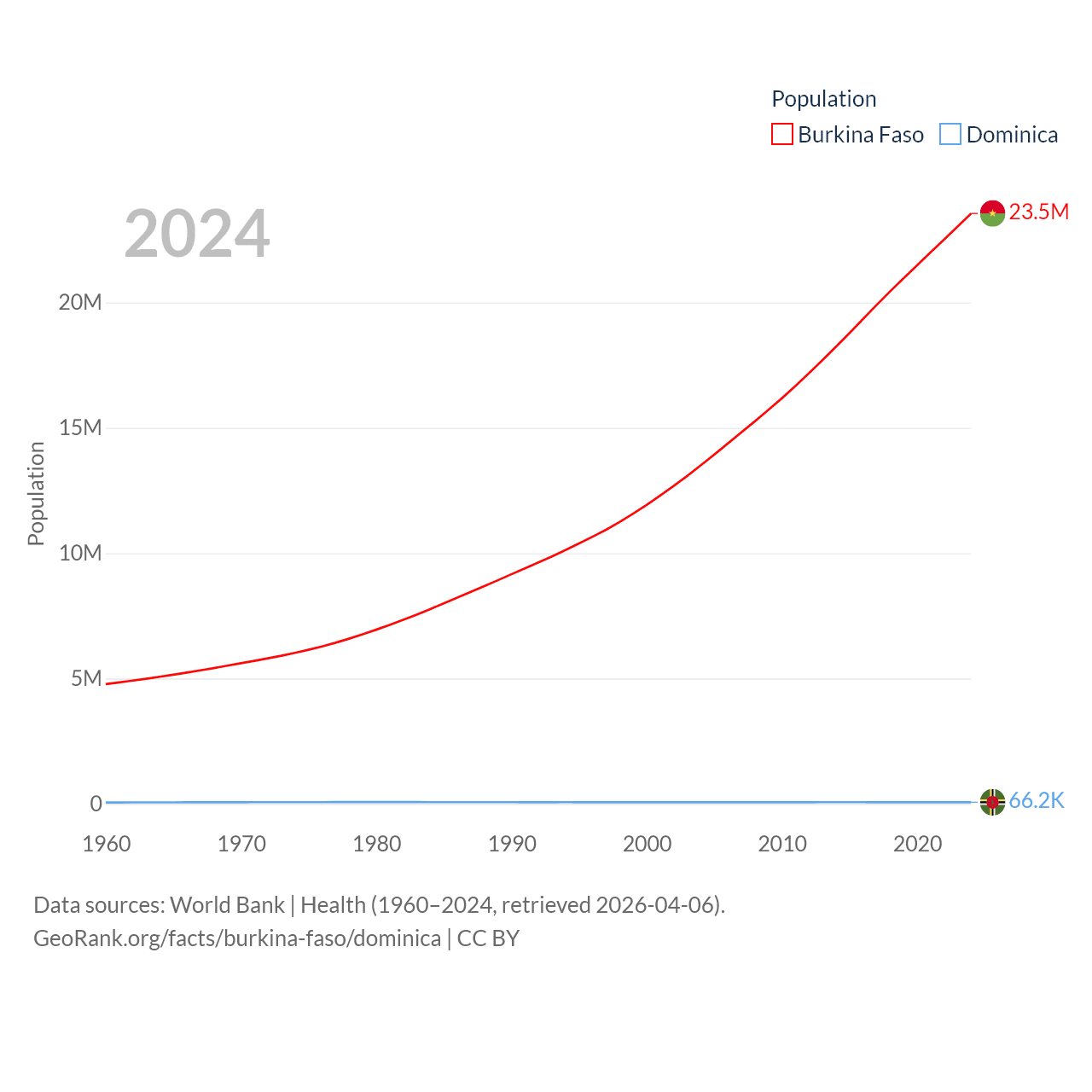 Burkina Faso has a population of 23.5M (ranked 59/197), compared with 66.2K in Dominica (ranked 188/197). Burkina Faso's land area is 105,638 sq mi versus 289.6 sq mi for Dominica (ranked 73rd vs. 175th).