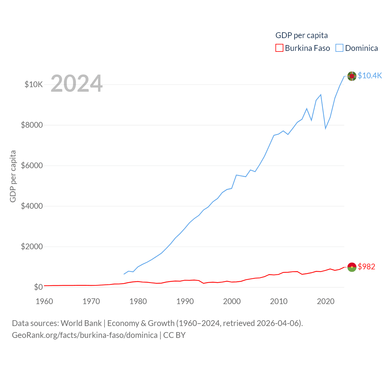 By GDP, Burkina Faso ranks 122/197 ($23.1B) and Dominica ranks 190/197 ($689M). By GDP per capita, Burkina Faso ranks 180/197 ($982), while Dominica ranks 84/197 ($10,405).