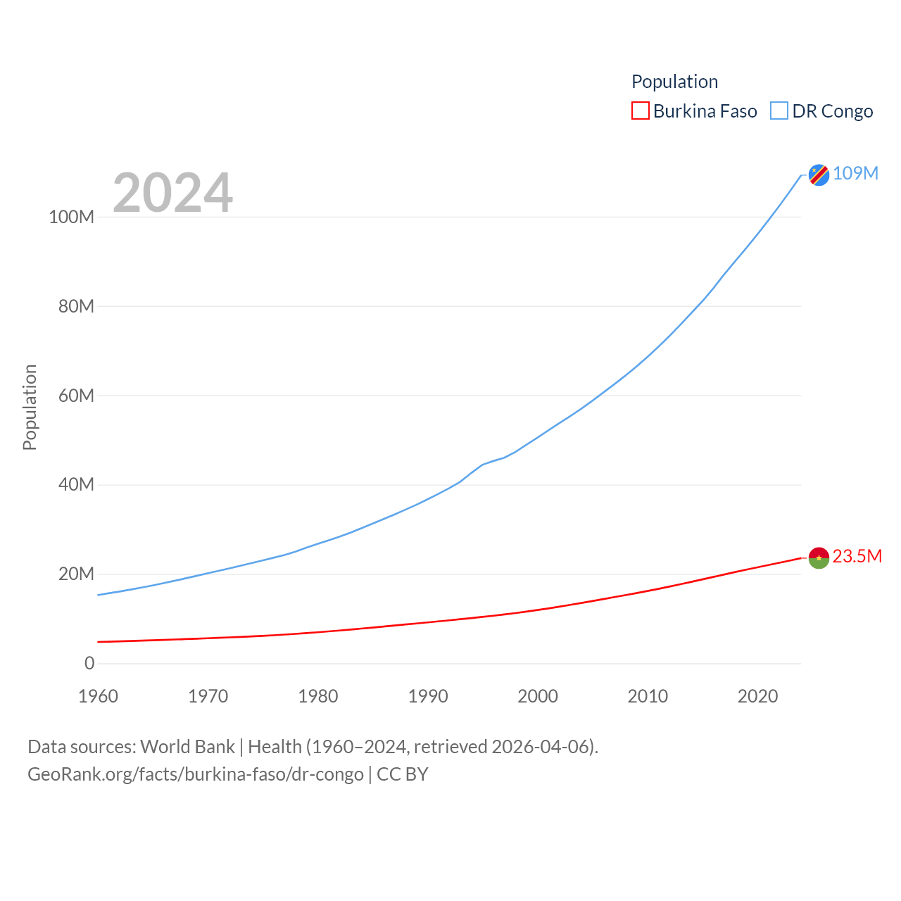 Burkina Faso has a population of 23.5M (ranked 59/197), compared with 109M in The DR Congo (ranked 15/197). Burkina Faso's land area is 105,638 sq mi versus 875,313 sq mi for The DR Congo (ranked 73rd vs. 11th).