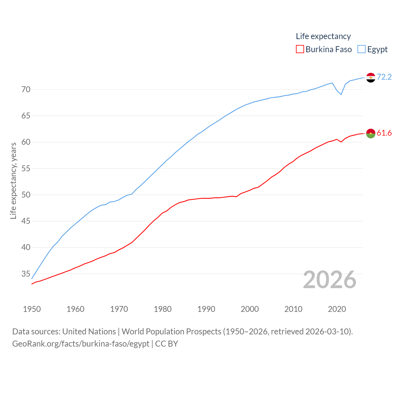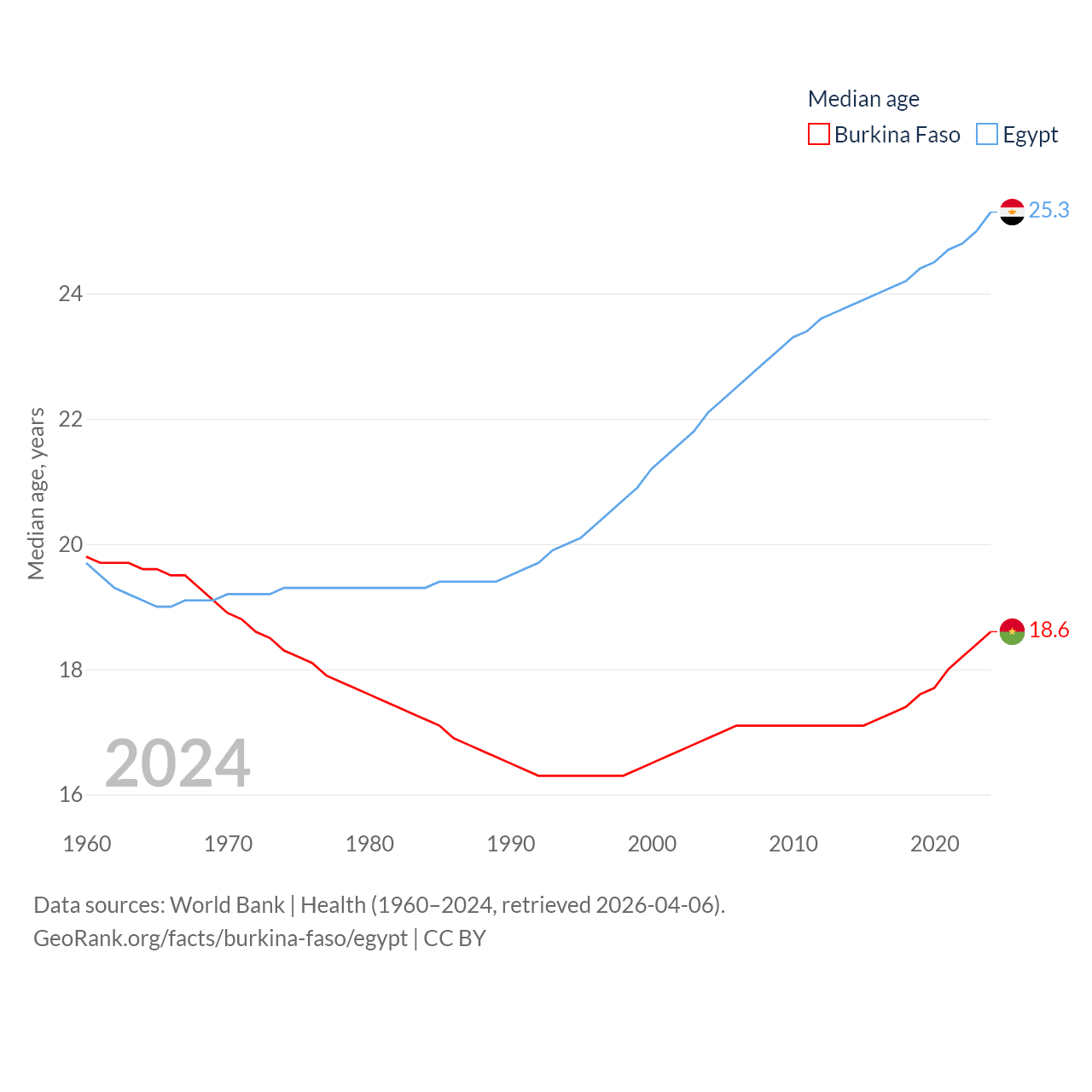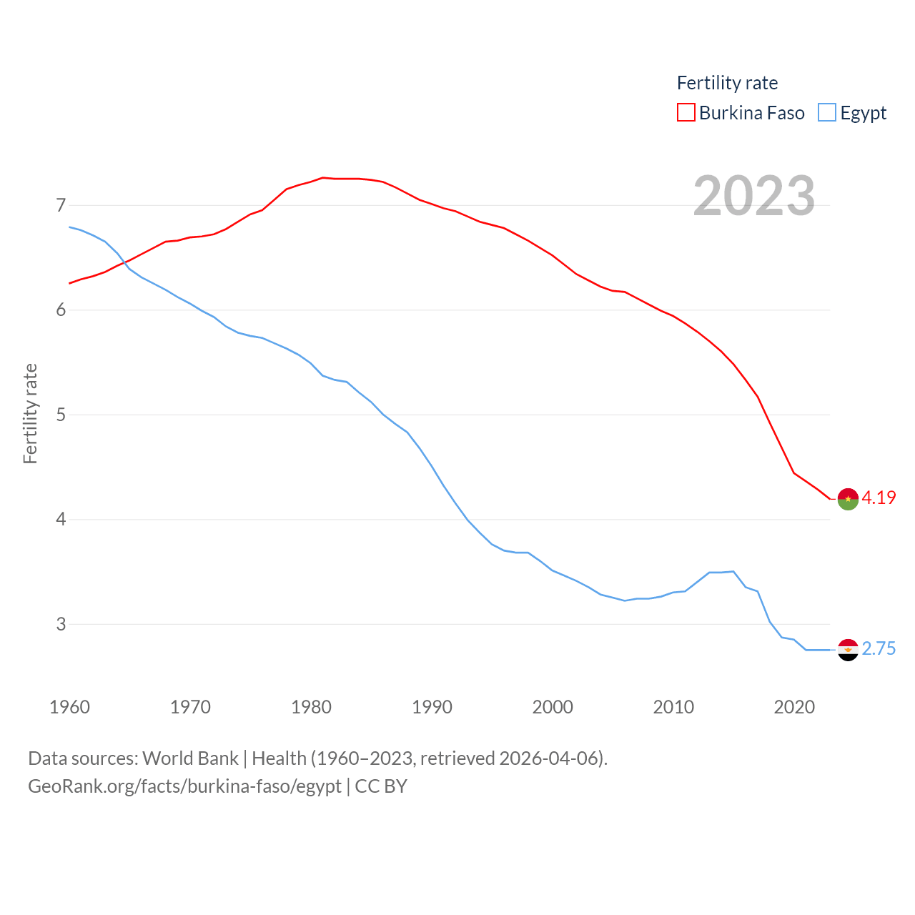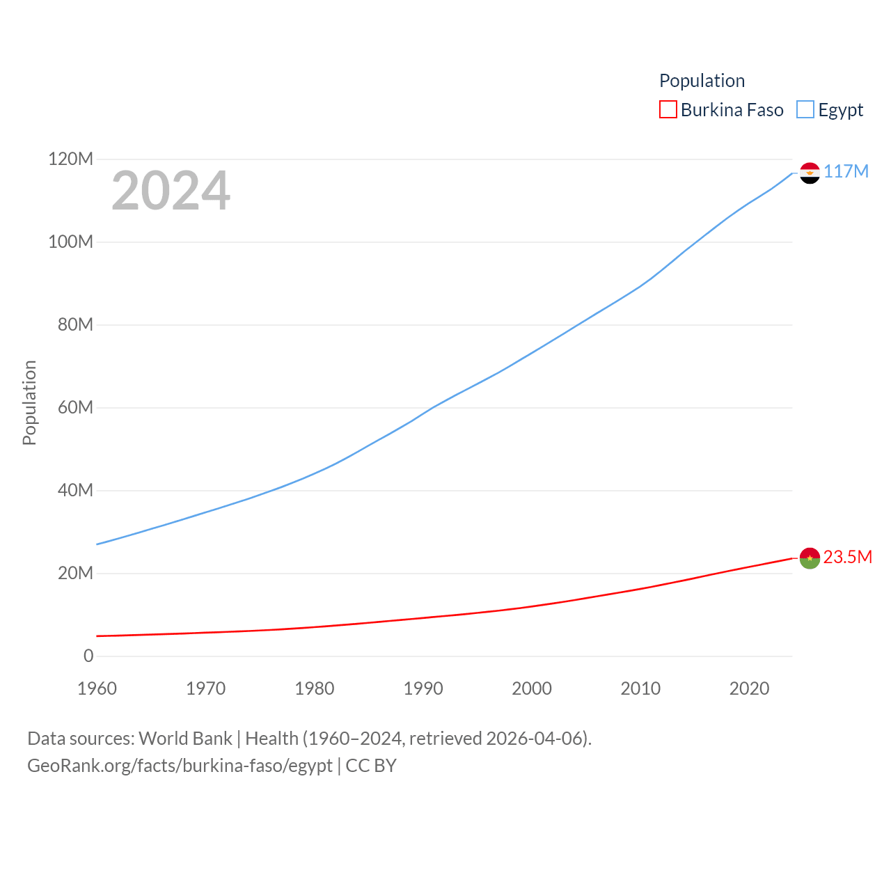 Burkina Faso has a population of 23.5M (ranked 59/197), compared with 117M in Egypt (ranked 13/197). Burkina Faso's land area is 105,638 sq mi versus 384,345 sq mi for Egypt (ranked 73rd vs. 29th).