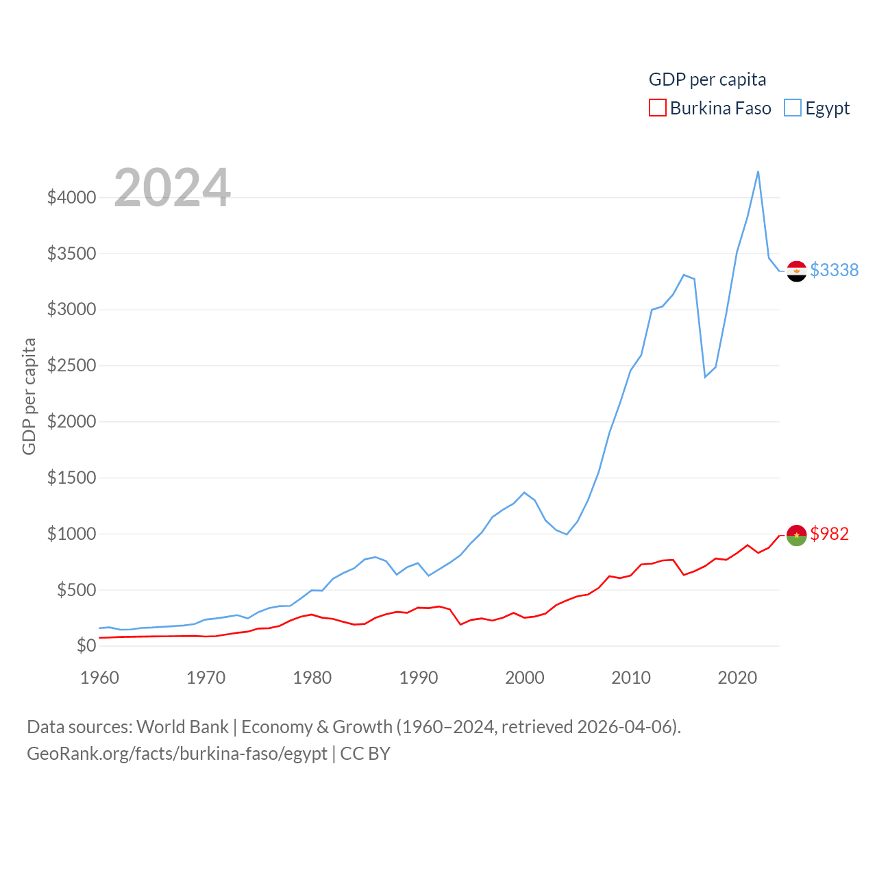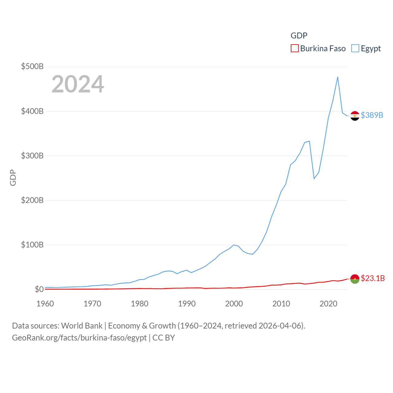 By GDP, Burkina Faso ranks 122/197 ($23.1B) and Egypt ranks 41/197 ($389B). By GDP per capita, Burkina Faso ranks 180/197 ($982), while Egypt ranks 138/197 ($3,338).