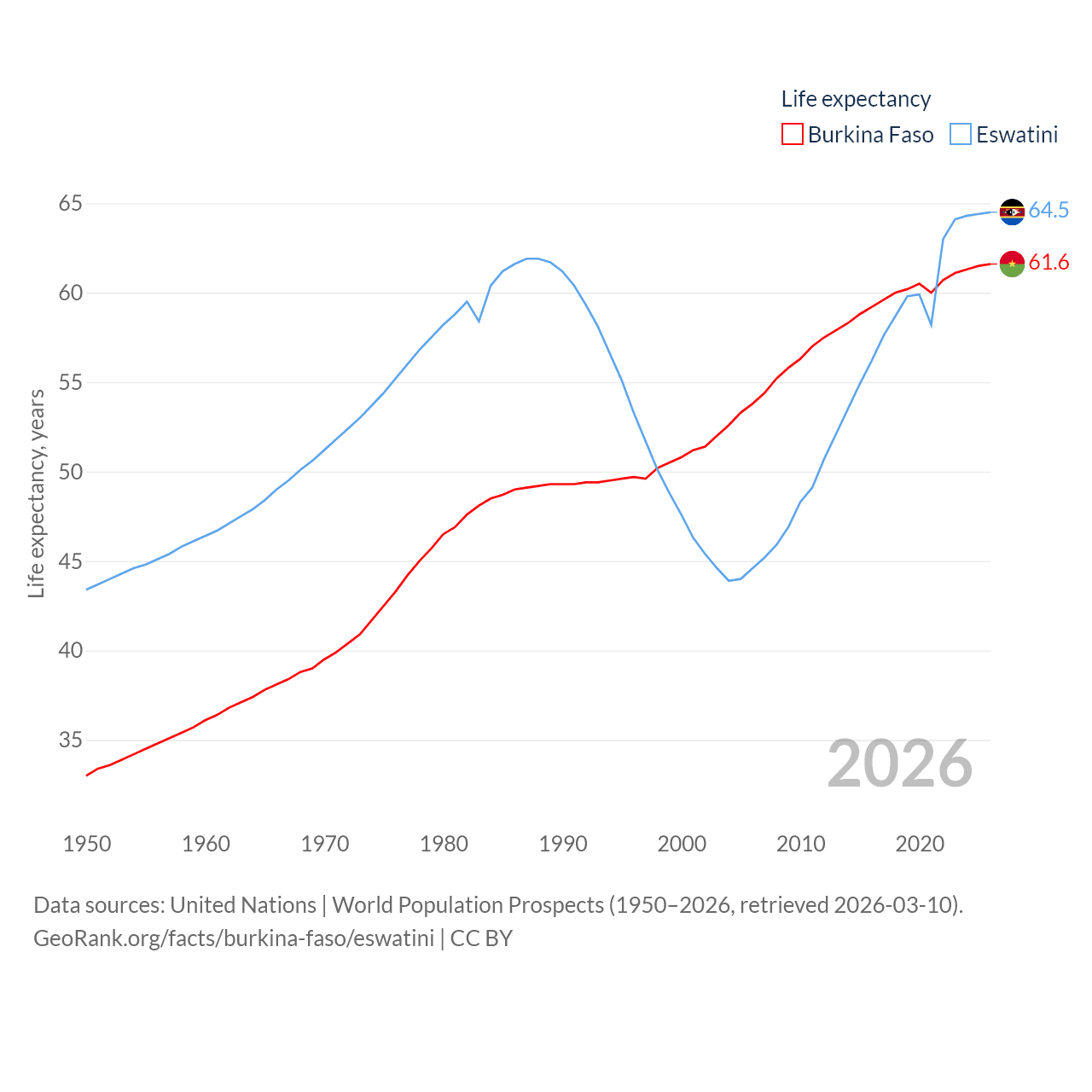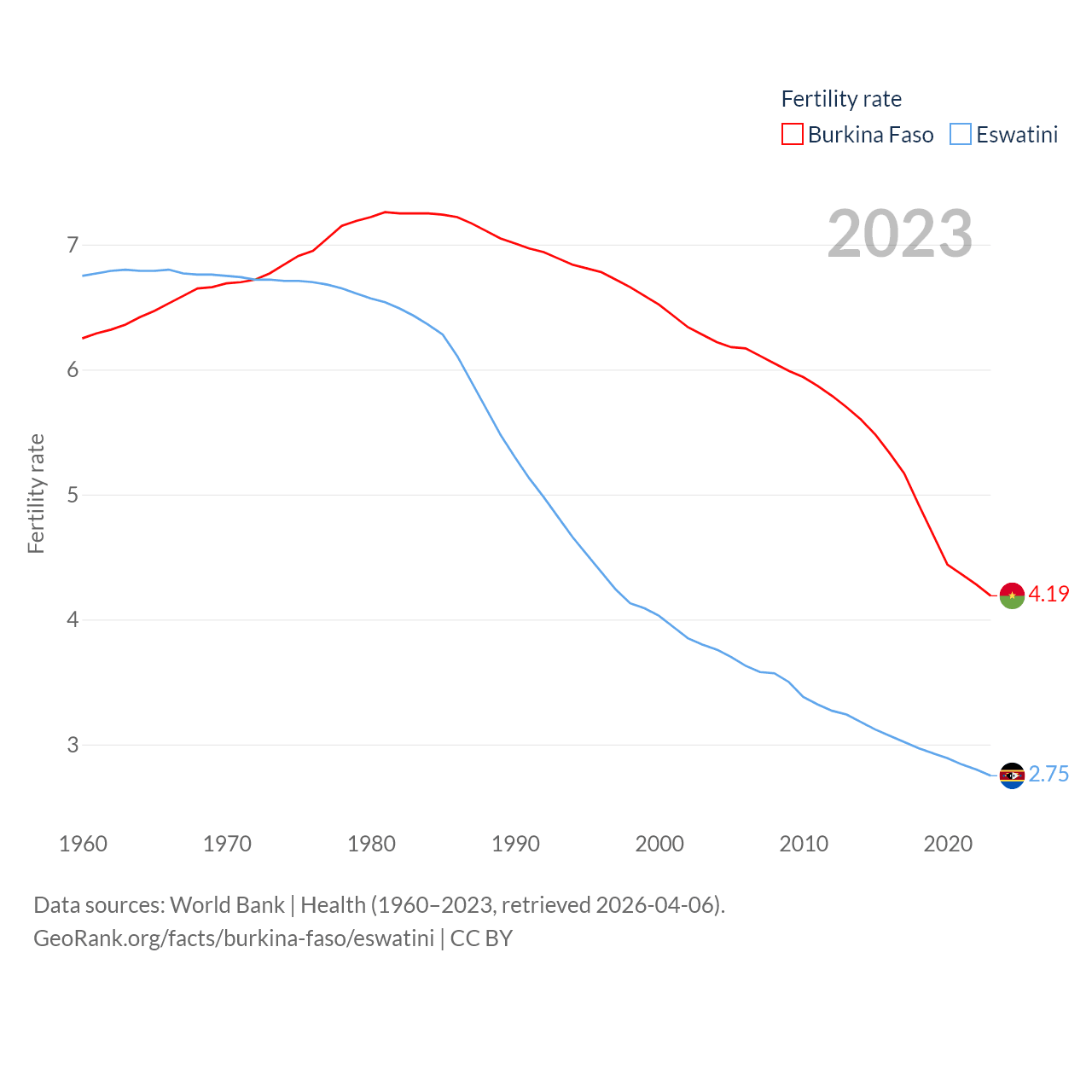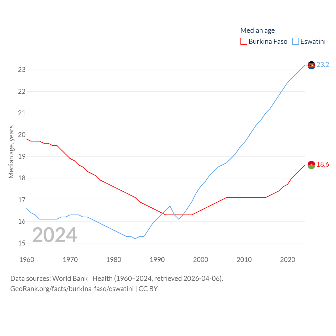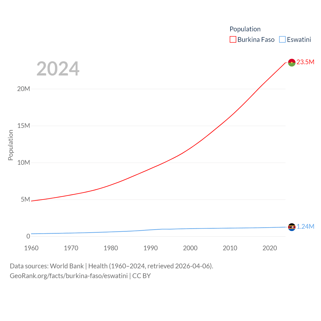 Burkina Faso has a population of 23.5M (ranked 59/197), compared with 1.24M in Eswatini (ranked 157/197). Burkina Faso's land area is 105,638 sq mi versus 6,641 sq mi for Eswatini (ranked 73rd vs. 154th).