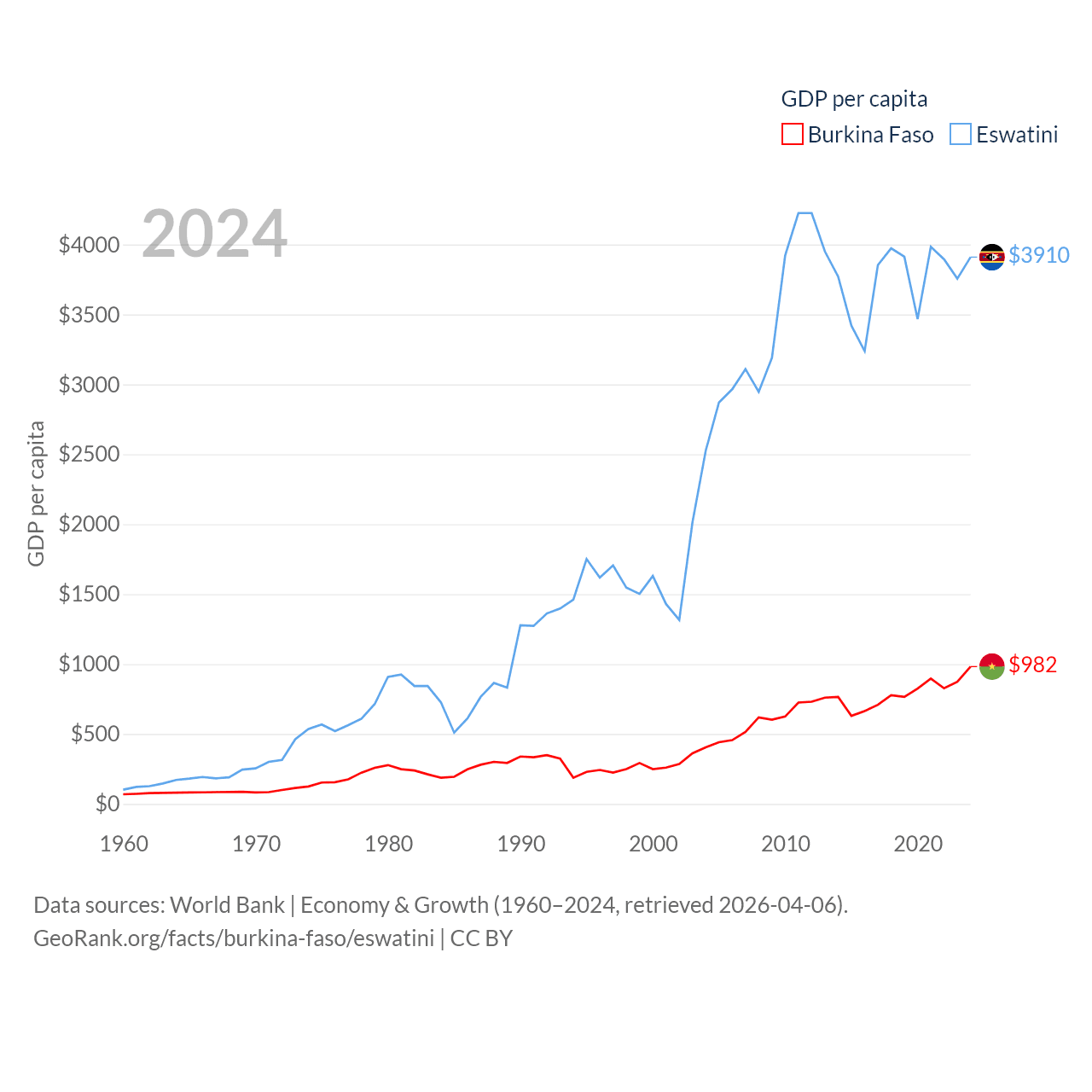 By GDP, Burkina Faso ranks 122/197 ($23.1B) and Eswatini ranks 162/197 ($4.86B). By GDP per capita, Burkina Faso ranks 180/197 ($982), while Eswatini ranks 131/197 ($3,910).