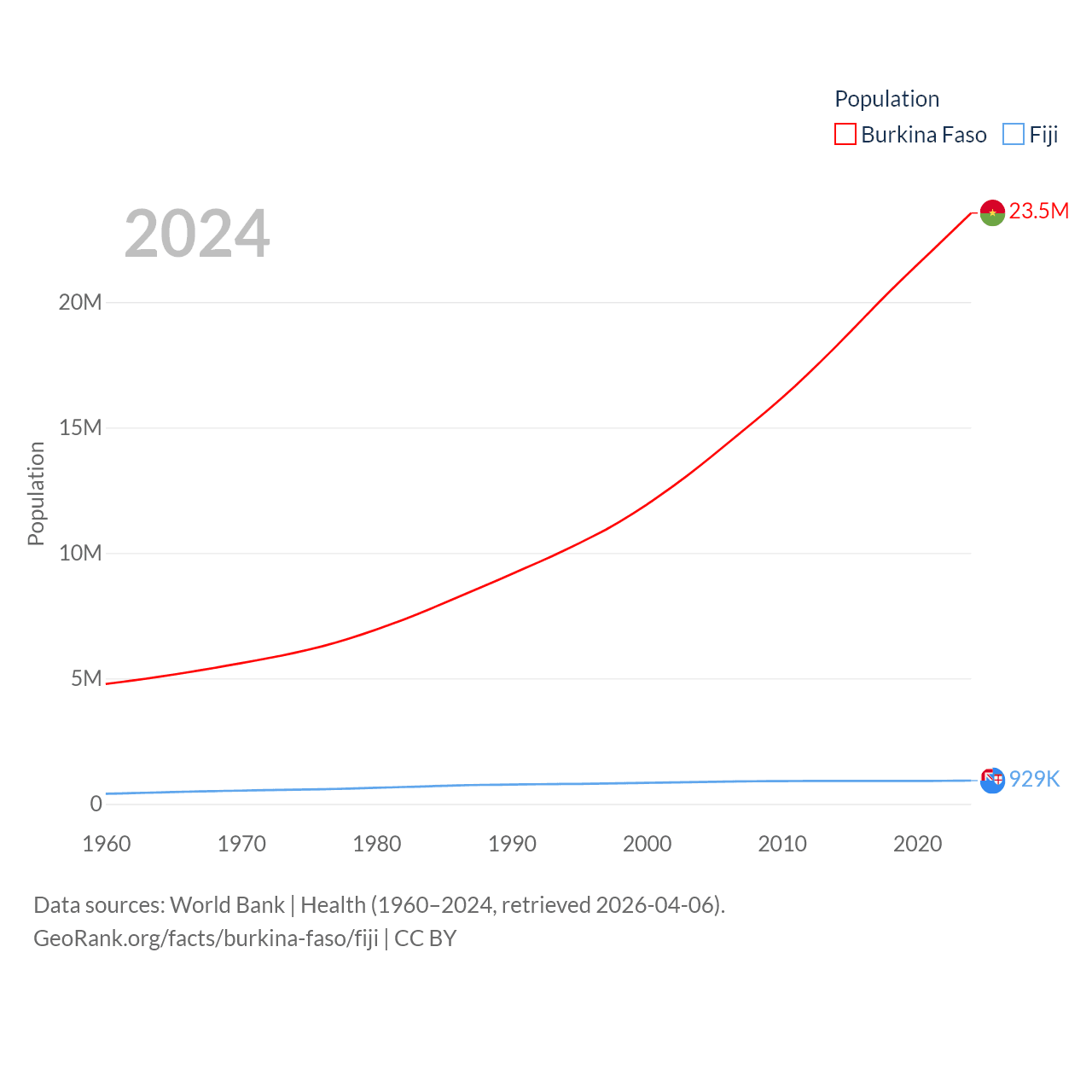 Burkina Faso has a population of 23.5M (ranked 59/197), compared with 929K in Fiji (ranked 159/197). Burkina Faso's land area is 105,638 sq mi versus 7,054 sq mi for Fiji (ranked 73rd vs. 152nd).