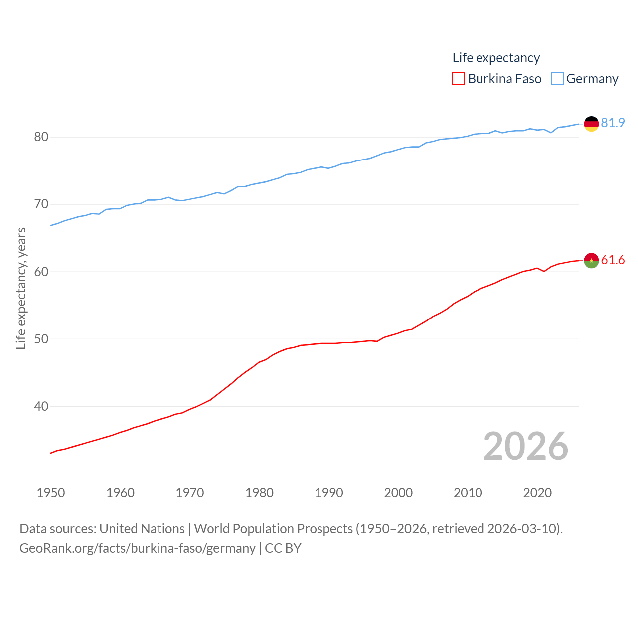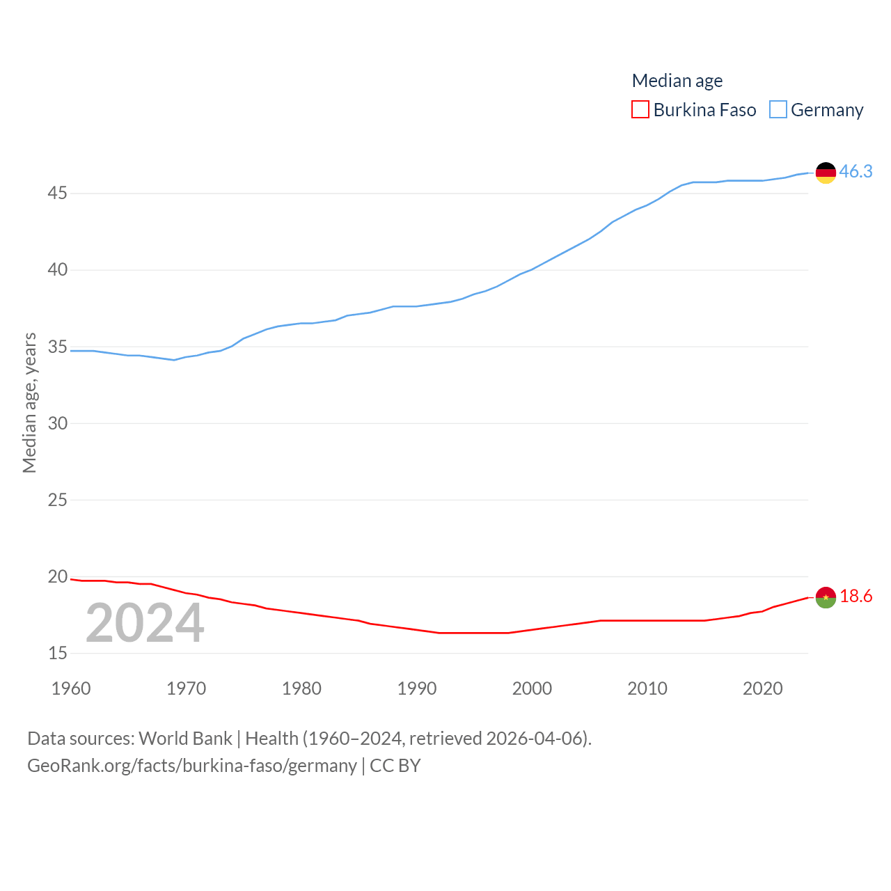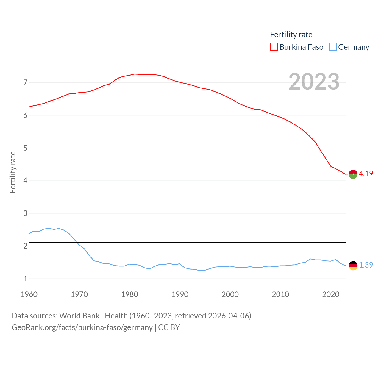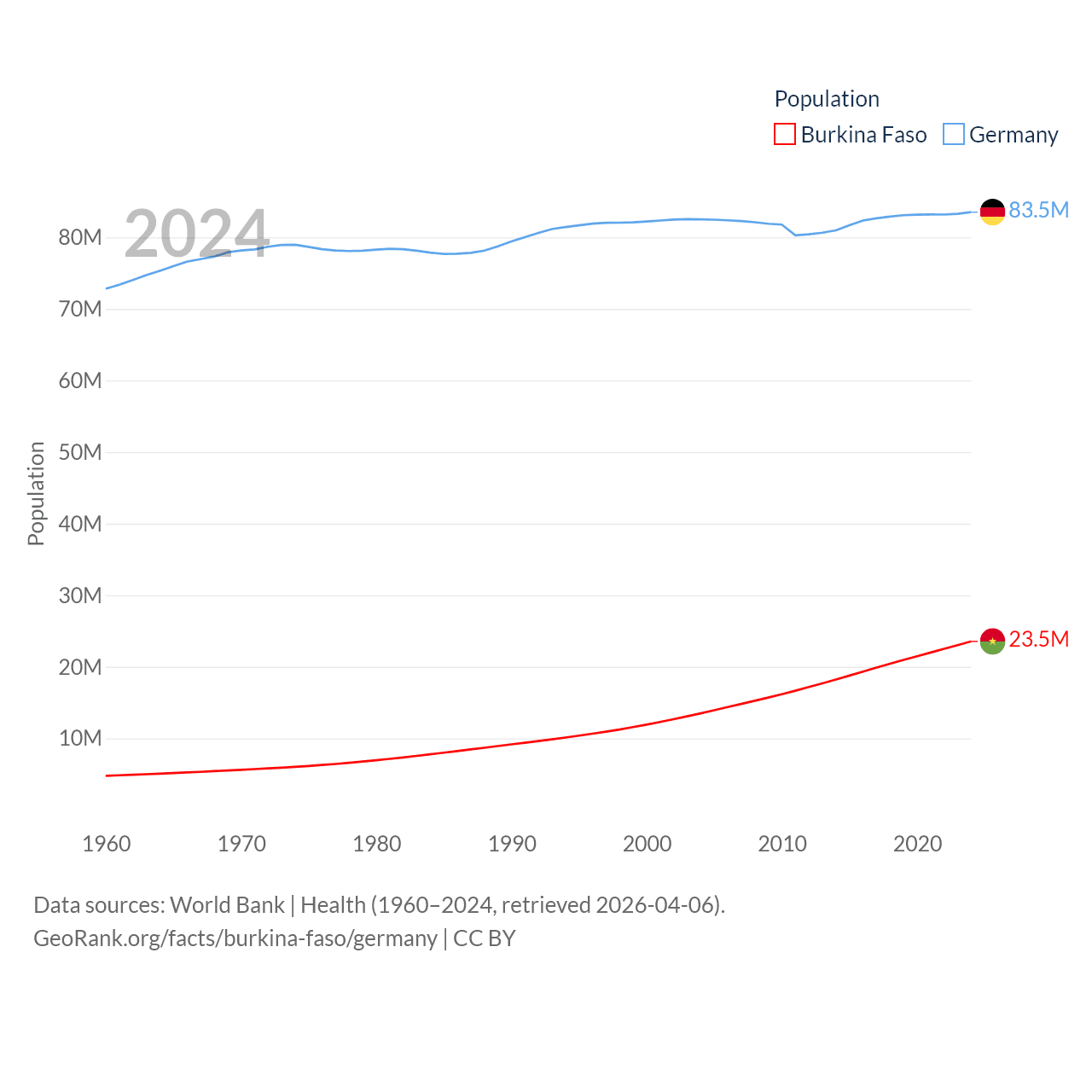 Burkina Faso has a population of 23.5M (ranked 59/197), compared with 83.5M in Germany (ranked 19/197). Burkina Faso's land area is 105,638 sq mi versus 134,916 sq mi for Germany (ranked 73rd vs. 63rd).