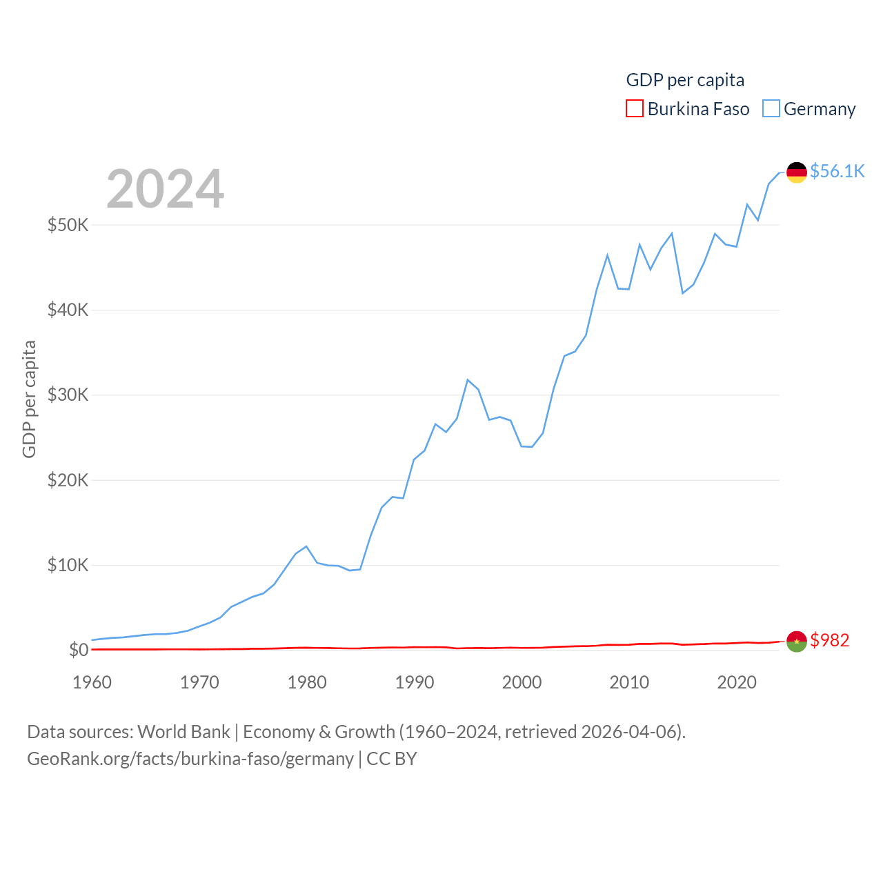 By GDP, Burkina Faso ranks 122/197 ($23.1B) and Germany ranks 3/197 ($4.69T). By GDP per capita, Burkina Faso ranks 180/197 ($982), while Germany ranks 19/197 ($56,104).
