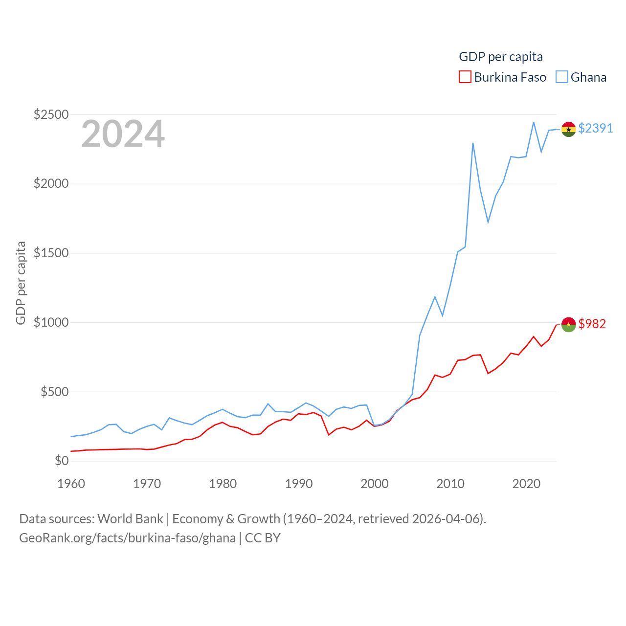 By GDP, Burkina Faso ranks 122/197 ($23.1B) and Ghana ranks 80/197 ($82.3B). By GDP per capita, Burkina Faso ranks 180/197 ($982), while Ghana ranks 151/197 ($2,391).