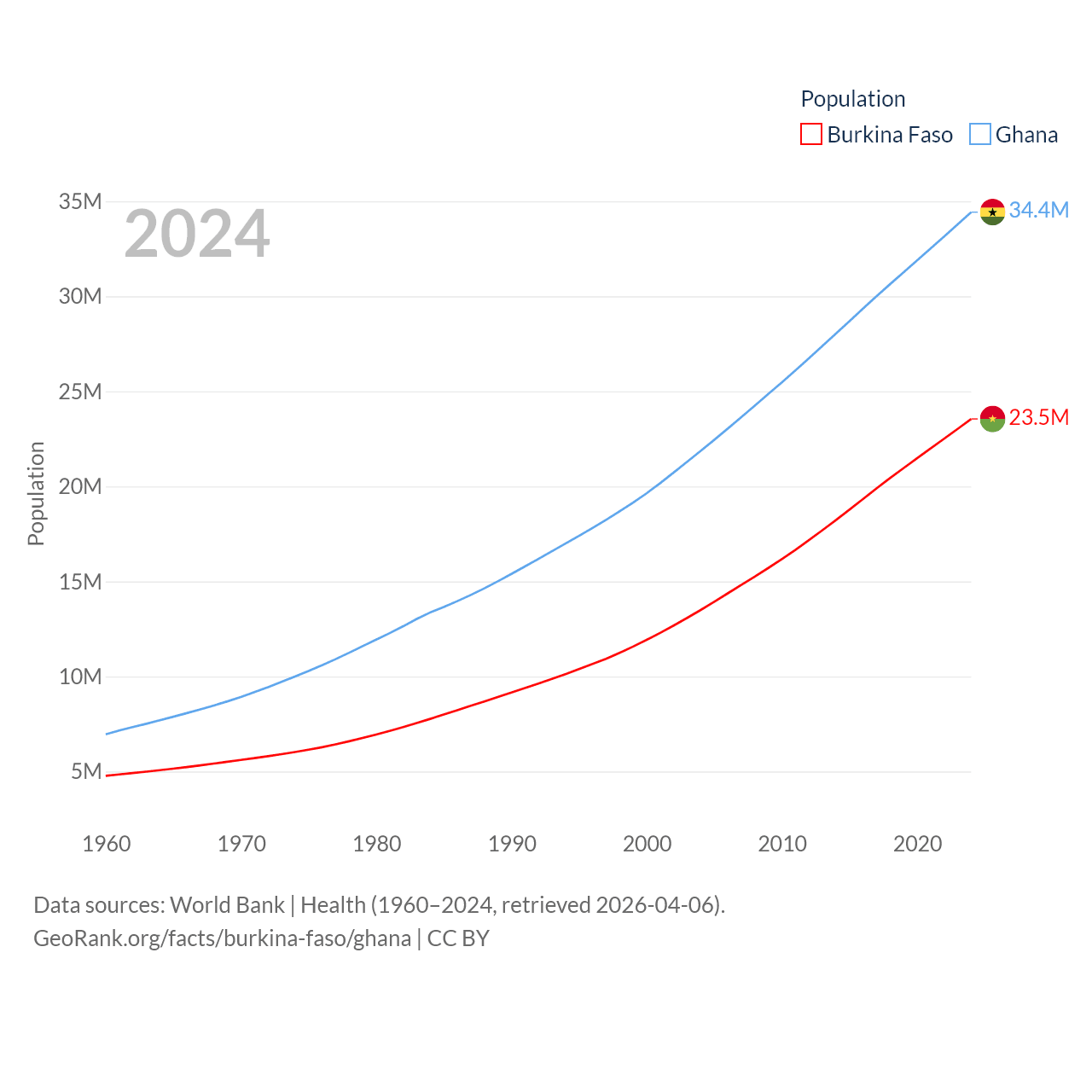 Burkina Faso has a population of 23.5M (ranked 59/197), compared with 34.4M in Ghana (ranked 47/197). Burkina Faso's land area is 105,638 sq mi versus 87,851 sq mi for Ghana (ranked 73rd vs. 81st).