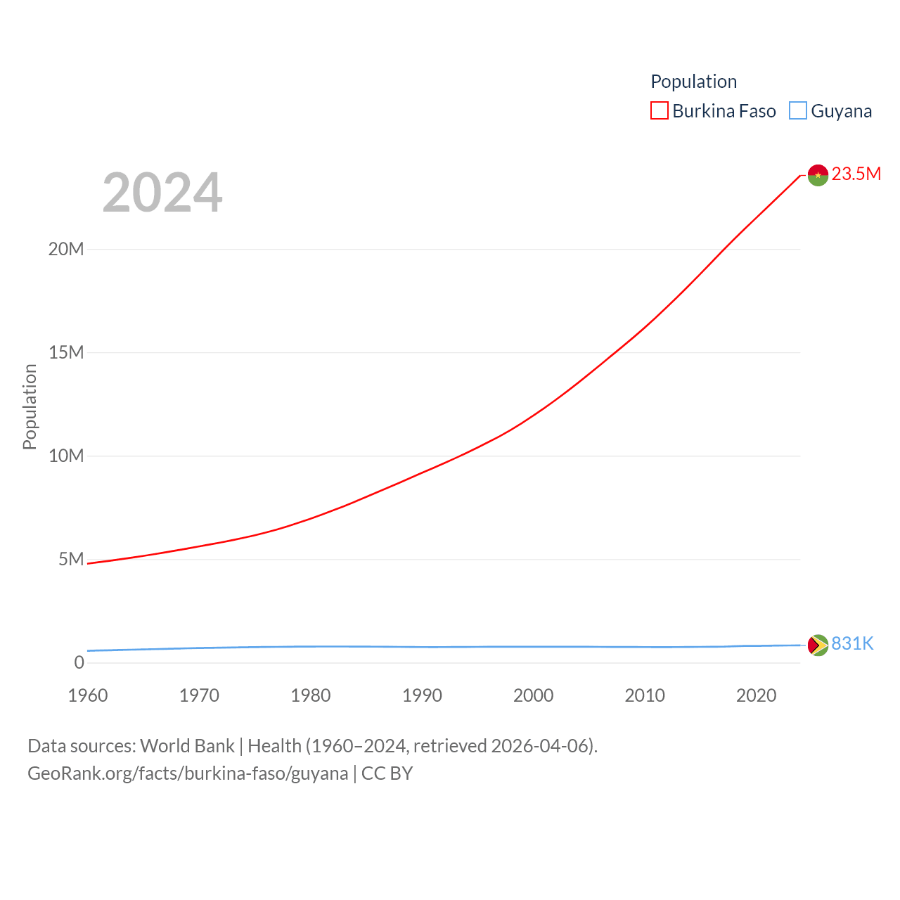 Burkina Faso has a population of 23.5M (ranked 59/197), compared with 831K in Guyana (ranked 161/197). Burkina Faso's land area is 105,638 sq mi versus 81,522 sq mi for Guyana (ranked 73rd vs. 82nd).