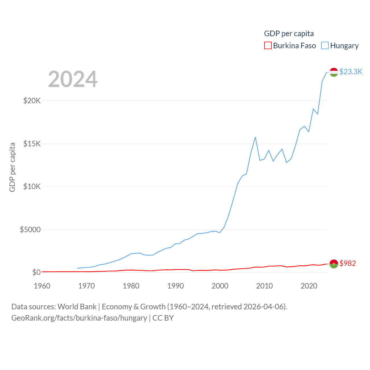 By GDP, Burkina Faso ranks 122/197 ($23.1B) and Hungary ranks 55/197 ($223B). By GDP per capita, Burkina Faso ranks 180/197 ($982), while Hungary ranks 55/197 ($23,292).