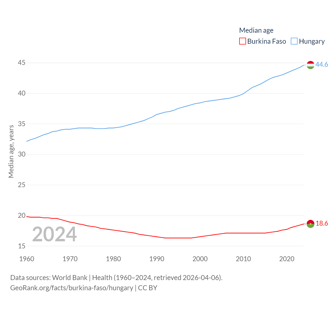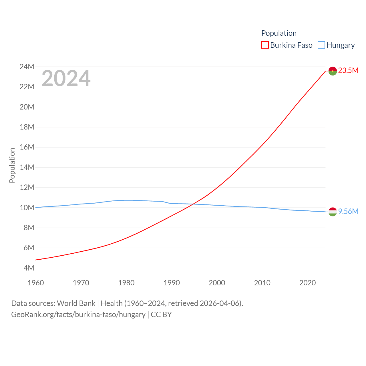 Burkina Faso has a population of 23.5M (ranked 59/197), compared with 9.56M in Hungary (ranked 97/197). Burkina Faso's land area is 105,638 sq mi versus 35,236 sq mi for Hungary (ranked 73rd vs. 109th).