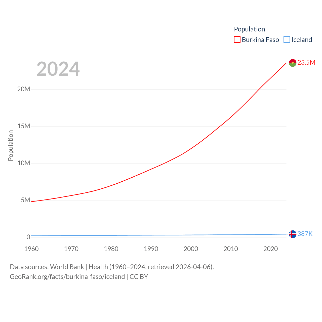 Burkina Faso has a population of 23.5M (ranked 59/197), compared with 387K in Iceland (ranked 173/197). Burkina Faso's land area is 105,638 sq mi versus 38,931 sq mi for Iceland (ranked 73rd vs. 104th).