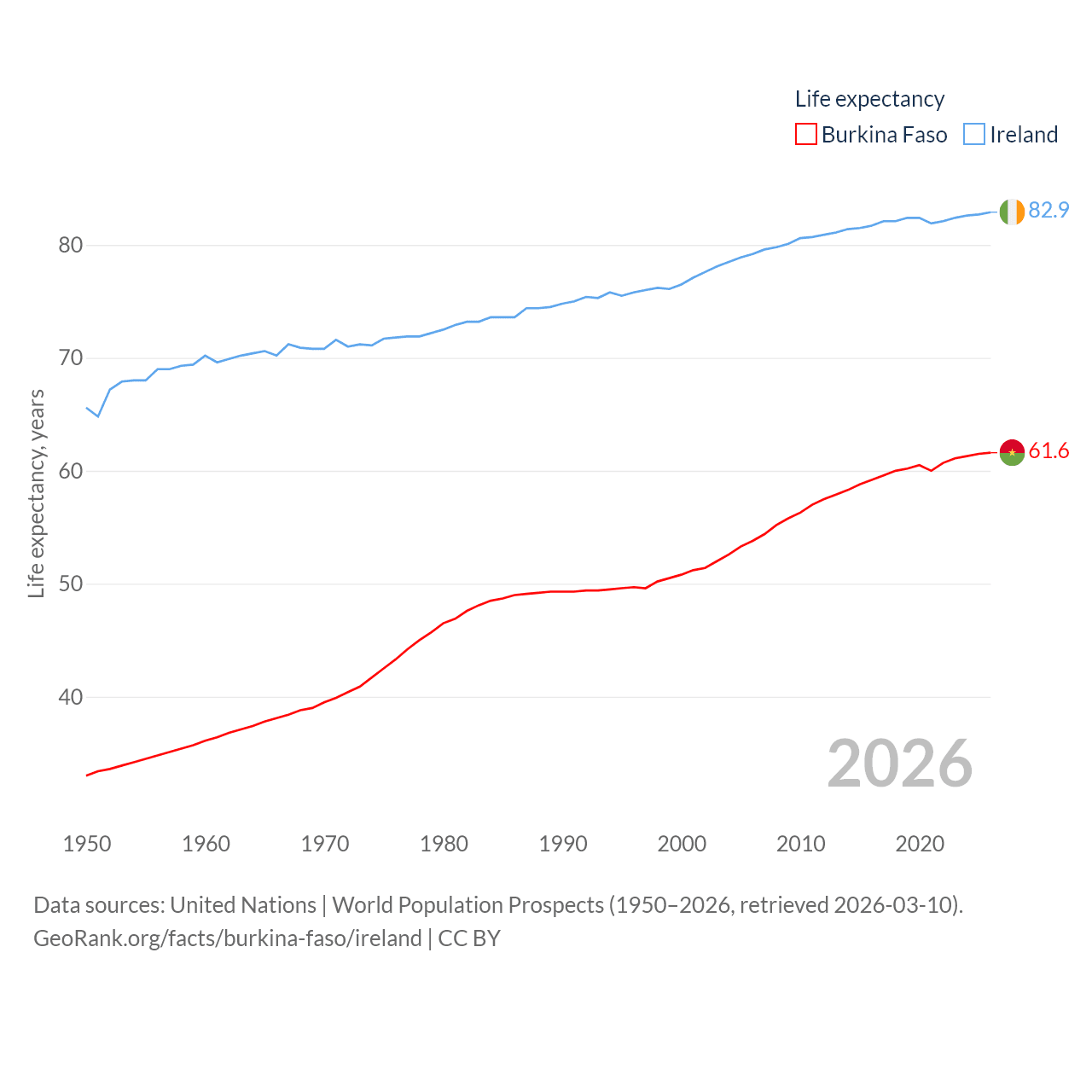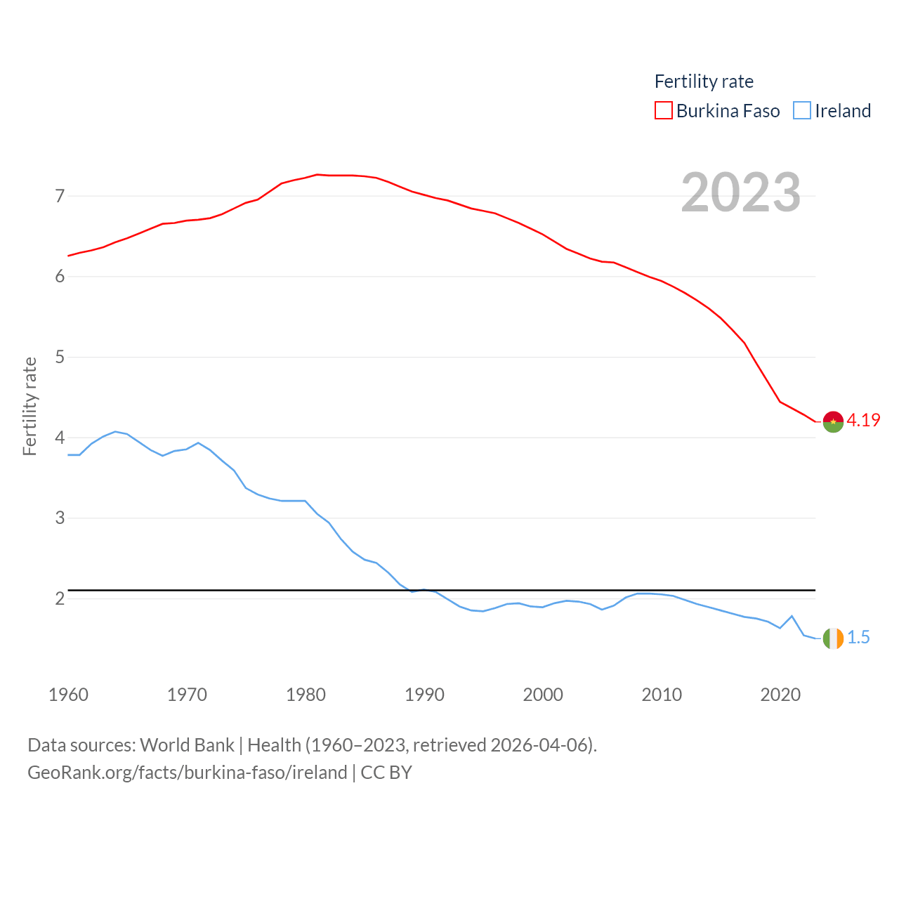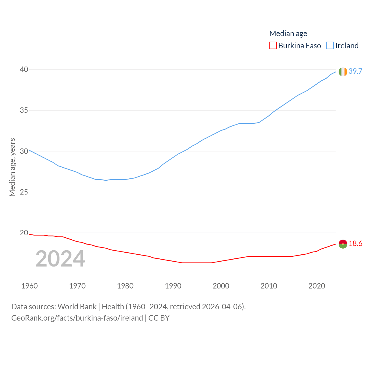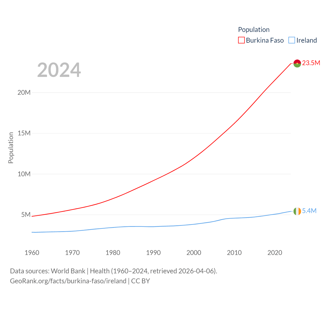 Burkina Faso has a population of 23.5M (ranked 59/197), compared with 5.4M in Ireland (ranked 120/197). Burkina Faso's land area is 105,638 sq mi versus 26,599 sq mi for Ireland (ranked 73rd vs. 119th).