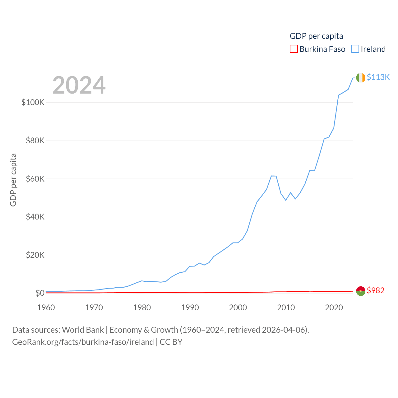By GDP, Burkina Faso ranks 122/197 ($23.1B) and Ireland ranks 25/197 ($609B). By GDP per capita, Burkina Faso ranks 180/197 ($982), while Ireland ranks 4/197 ($112,895).