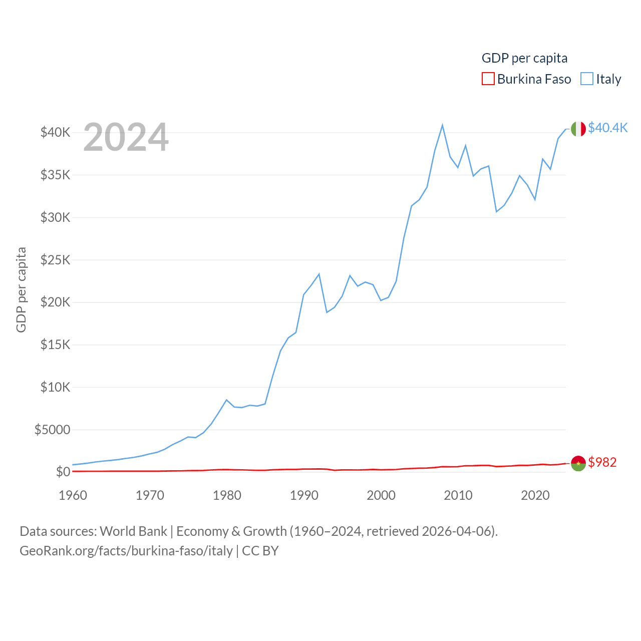 By GDP, Burkina Faso ranks 122/197 ($23.1B) and Italy ranks 8/197 ($2.38T). By GDP per capita, Burkina Faso ranks 180/197 ($982), while Italy ranks 29/197 ($40,385).