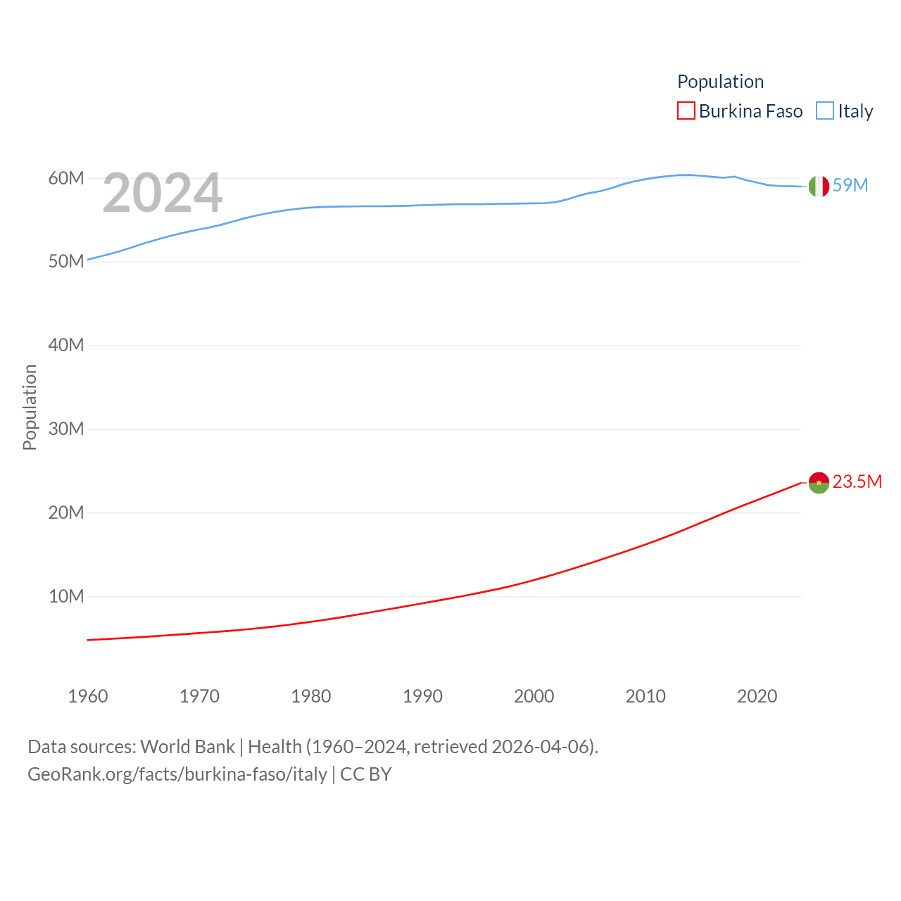 Burkina Faso has a population of 23.5M (ranked 59/197), compared with 59M in Italy (ranked 25/197). Burkina Faso's land area is 105,638 sq mi versus 114,178 sq mi for Italy (ranked 73rd vs. 72nd).