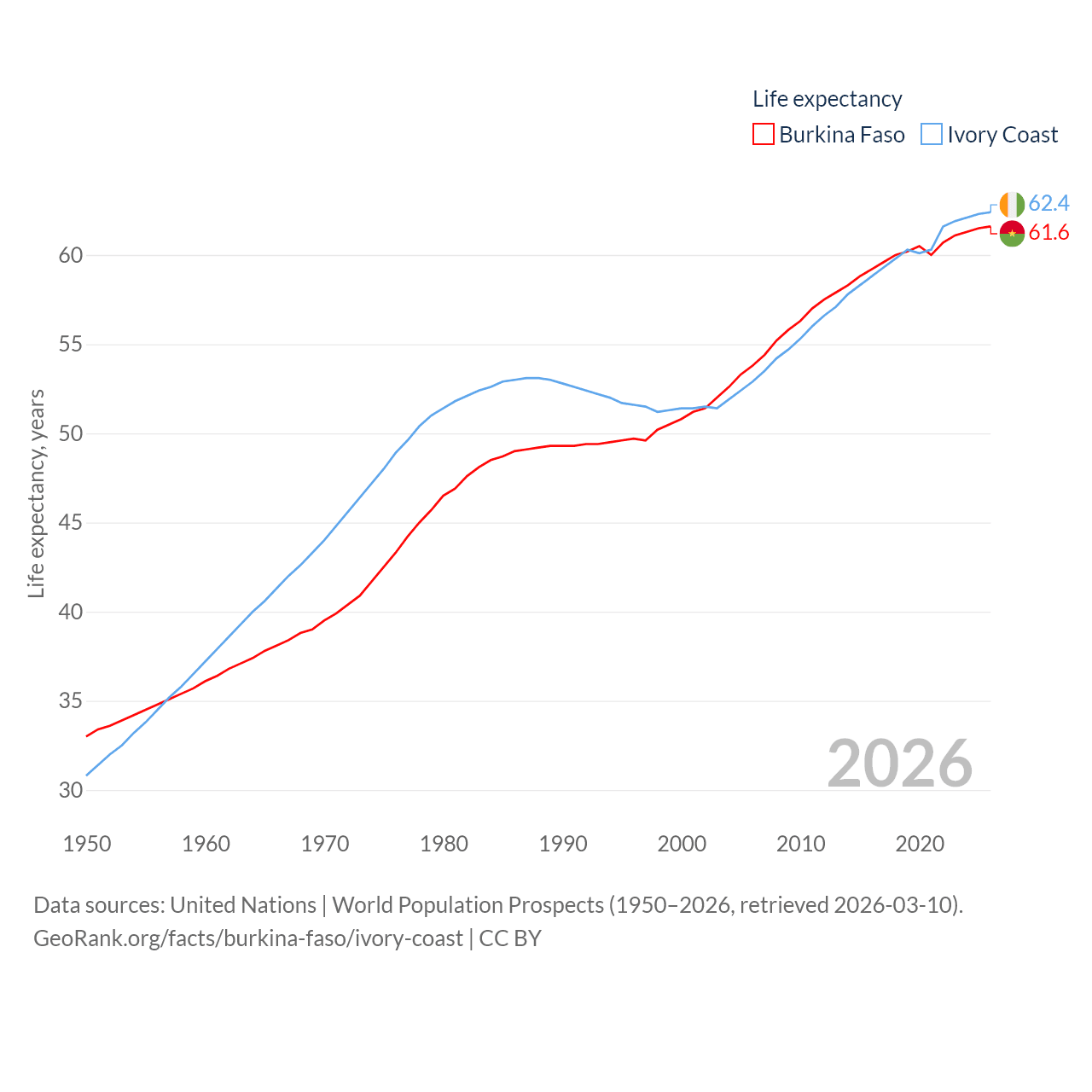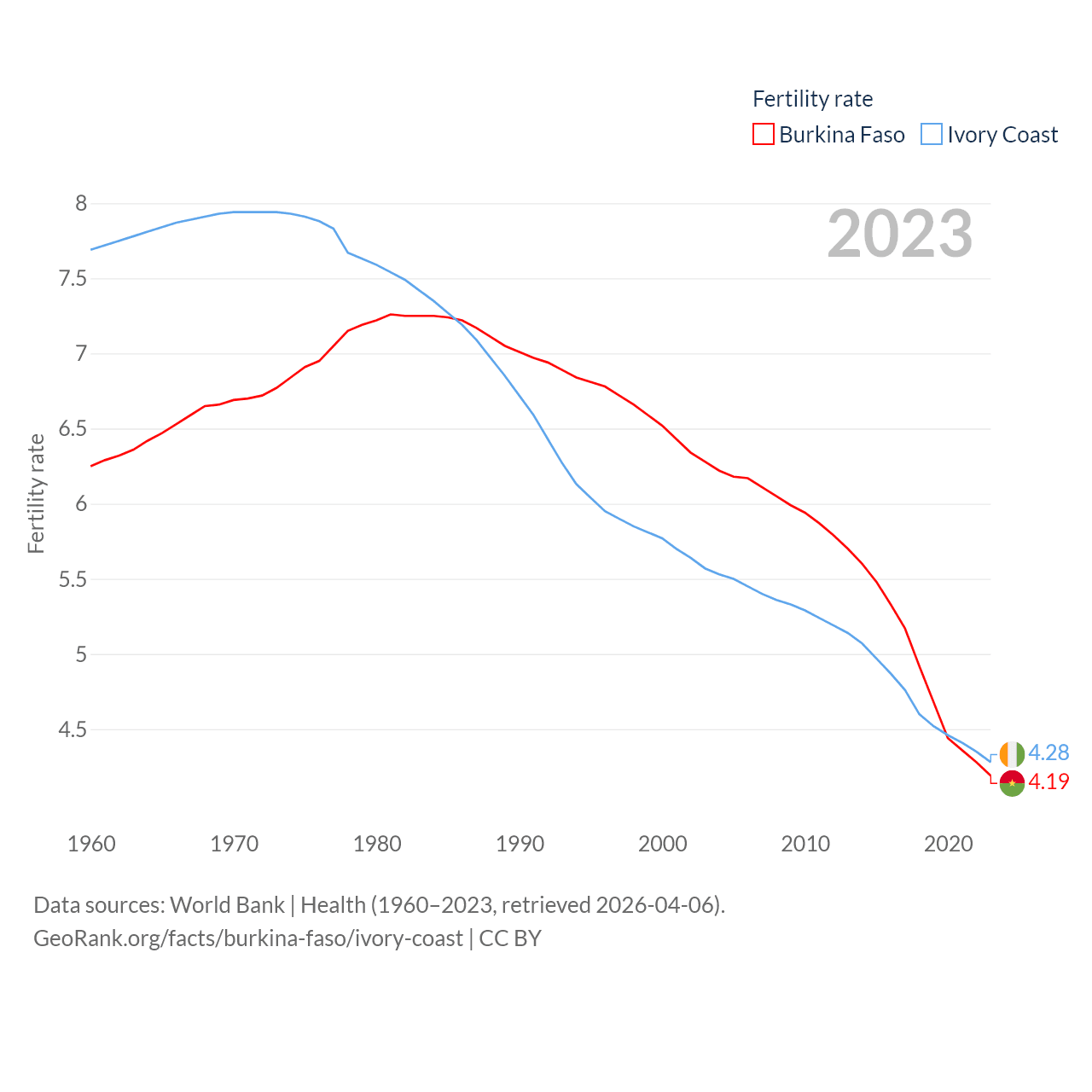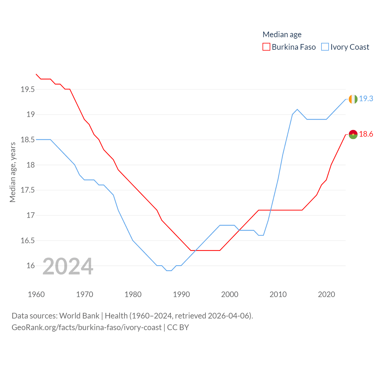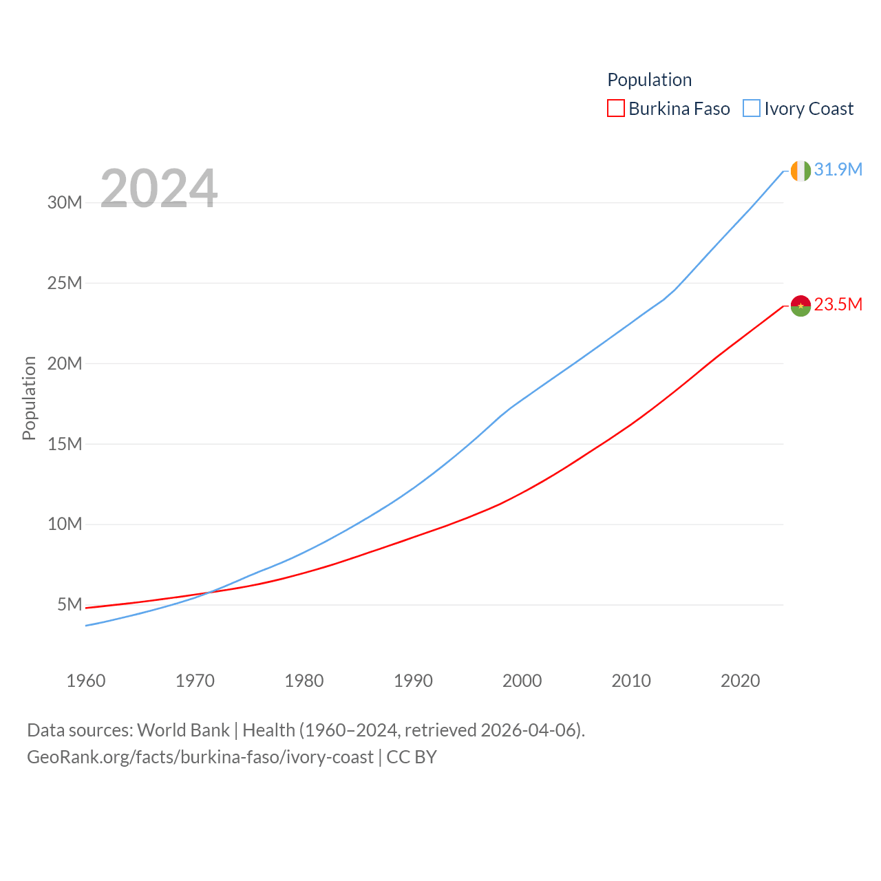 Burkina Faso has a population of 23.5M (ranked 59/197), compared with 31.9M in Ivory Coast (ranked 50/197). Burkina Faso's land area is 105,638 sq mi versus 122,780 sq mi for Ivory Coast (ranked 73rd vs. 66th).
