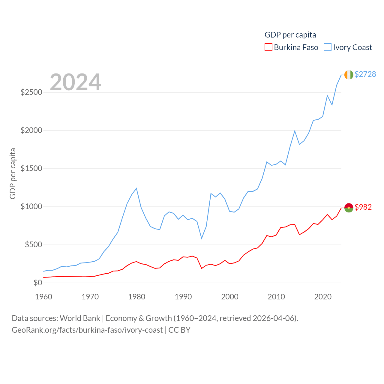By GDP, Burkina Faso ranks 122/197 ($23.1B) and Ivory Coast ranks 77/197 ($87.1B). By GDP per capita, Burkina Faso ranks 180/197 ($982), while Ivory Coast ranks 142/197 ($2,728).