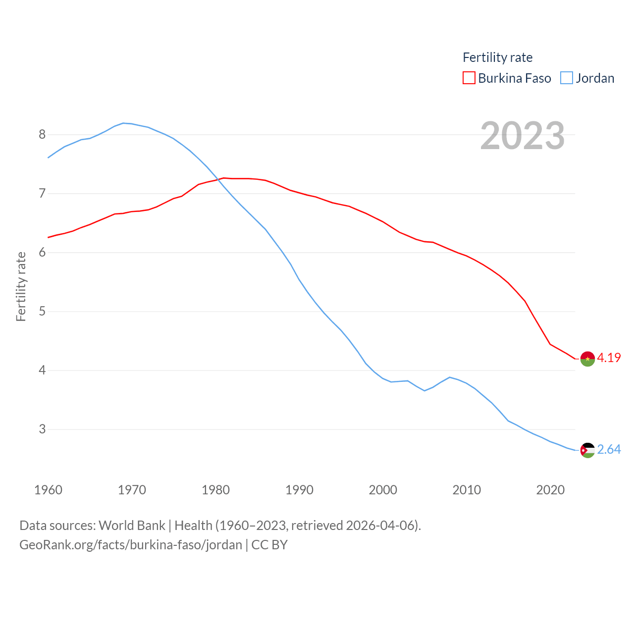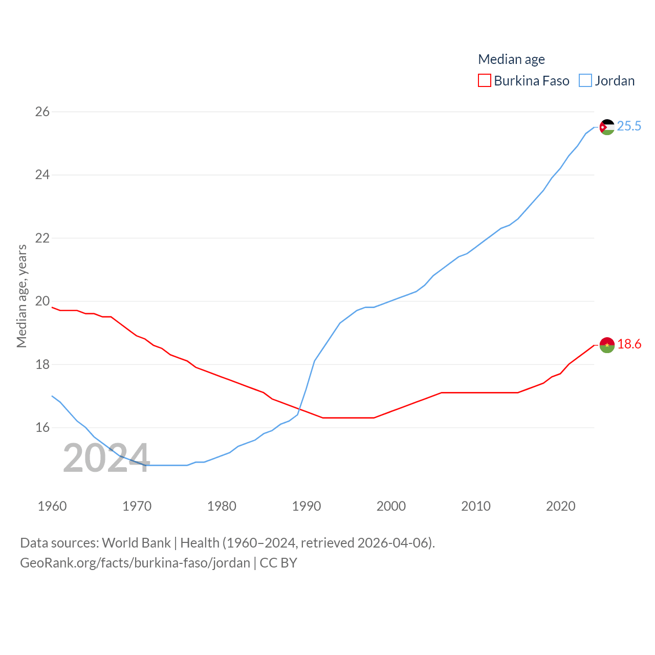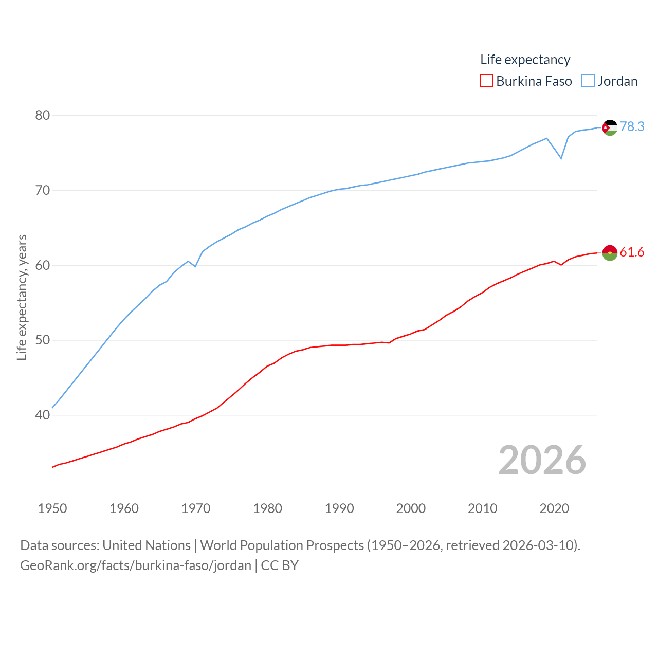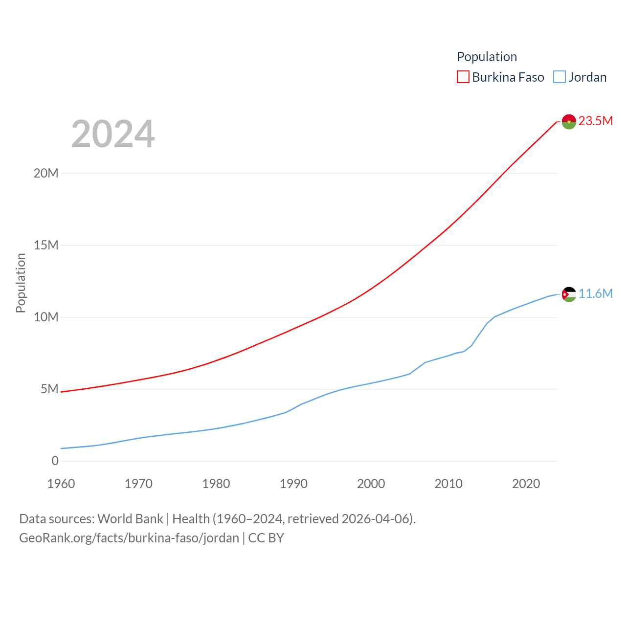 Burkina Faso has a population of 23.5M (ranked 59/197), compared with 11.6M in Jordan (ranked 84/197). Burkina Faso's land area is 105,638 sq mi versus 34,284 sq mi for Jordan (ranked 73rd vs. 110th).