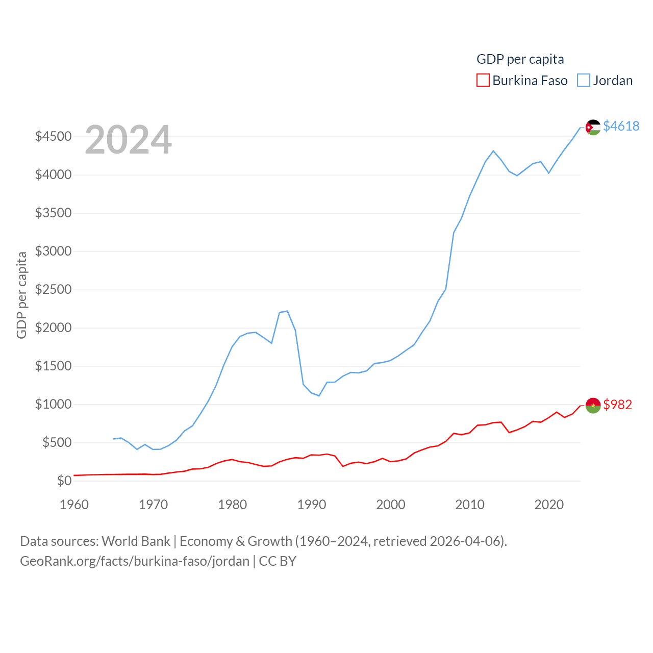 By GDP, Burkina Faso ranks 122/197 ($23.1B) and Jordan ranks 90/197 ($53.4B). By GDP per capita, Burkina Faso ranks 180/197 ($982), while Jordan ranks 123/197 ($4,618).
