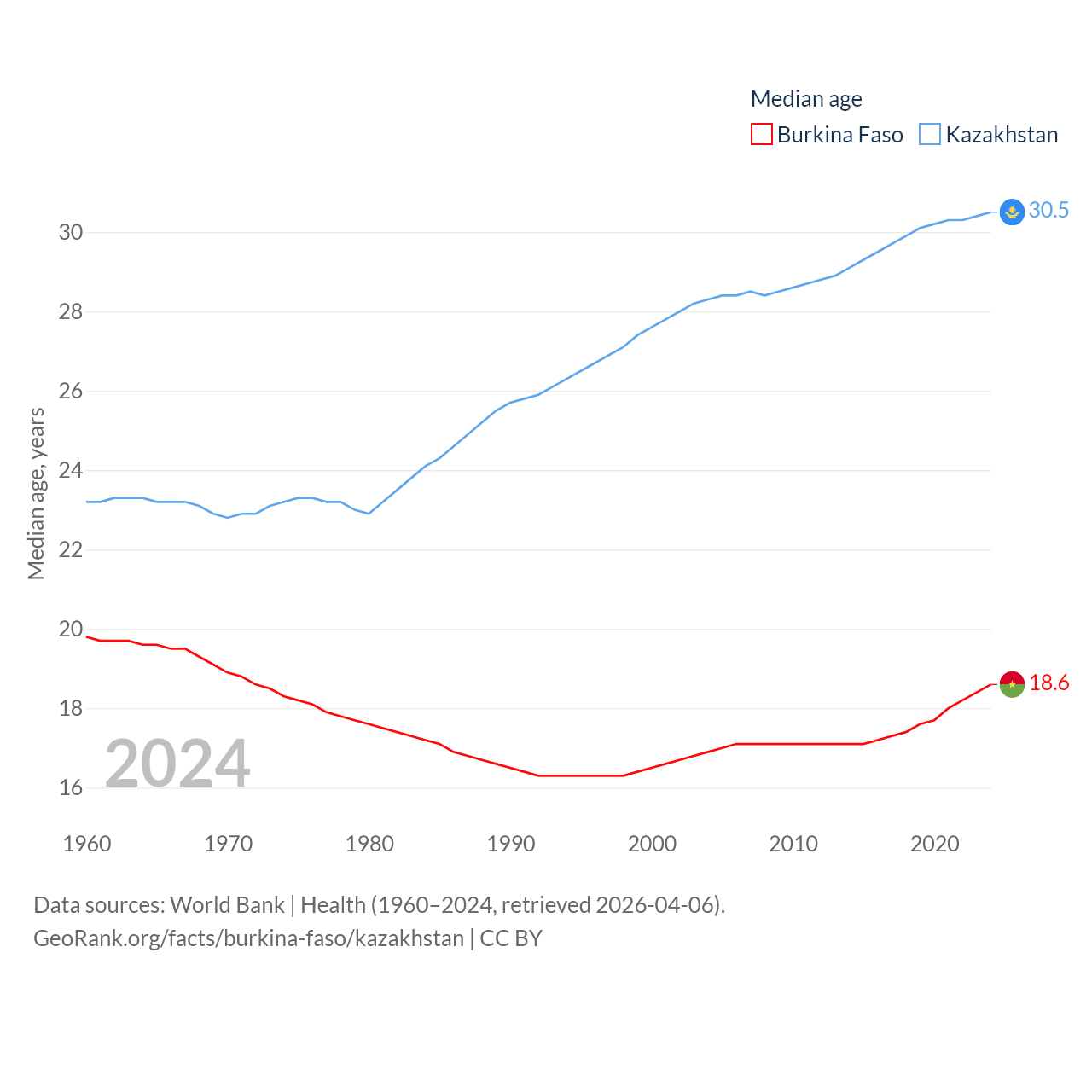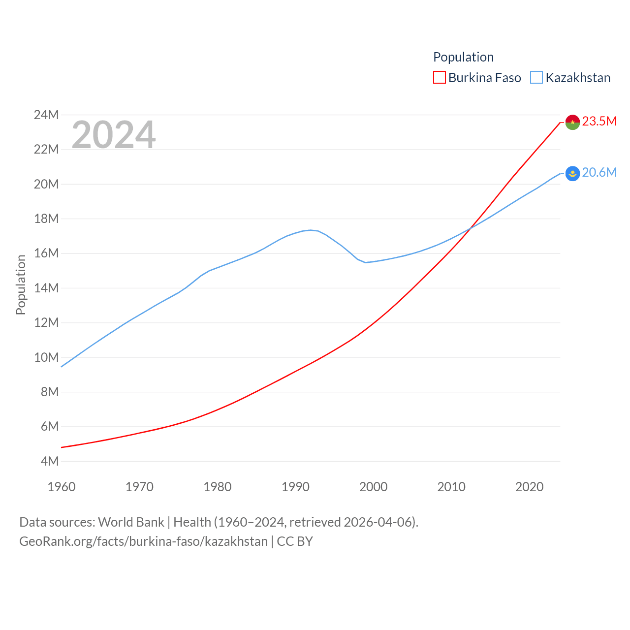 Burkina Faso has a population of 23.5M (ranked 59/197), compared with 20.6M in Kazakhstan (ranked 64/197). Burkina Faso's land area is 105,638 sq mi versus 1,042,360 sq mi for Kazakhstan (ranked 73rd vs. 9th).