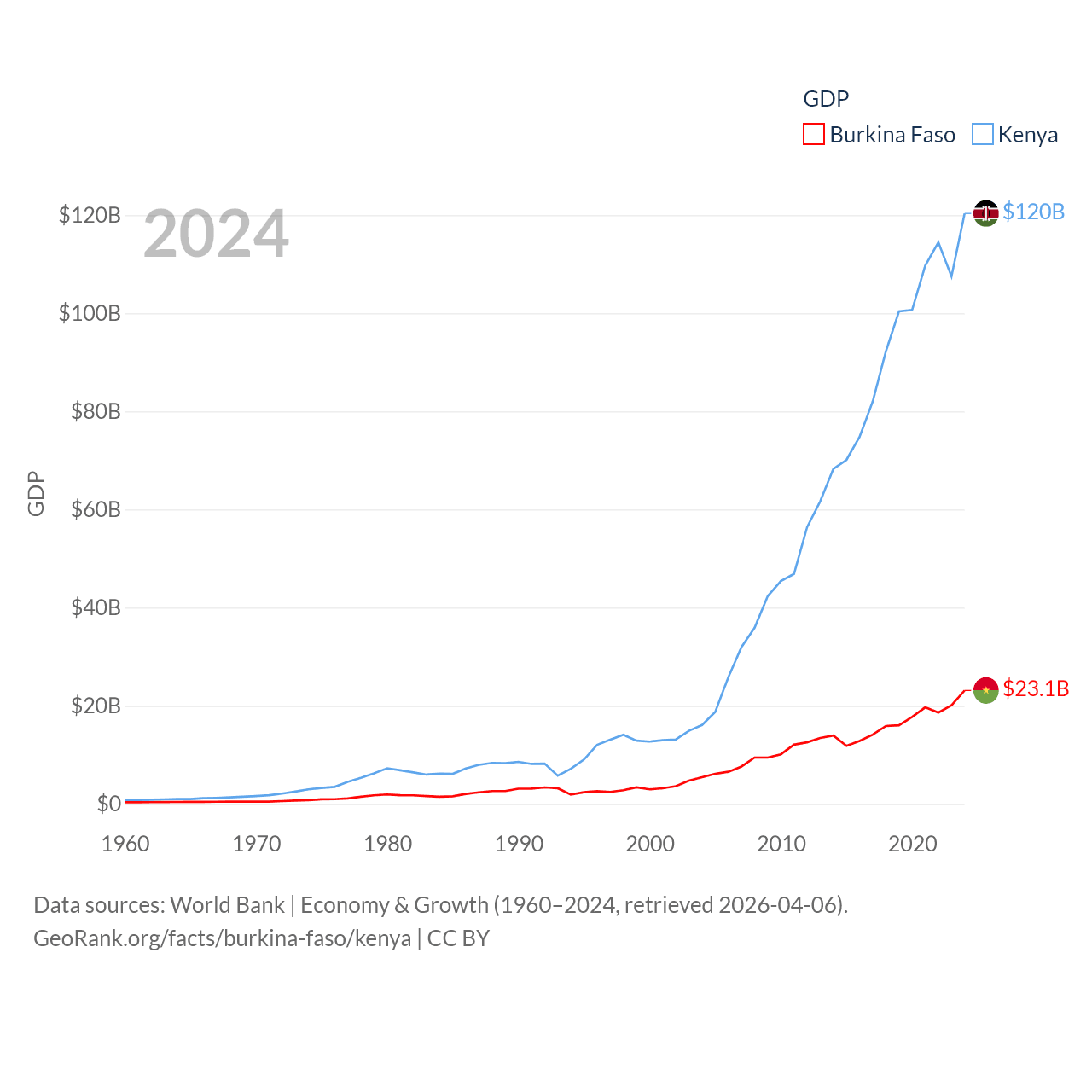 By GDP, Burkina Faso ranks 122/197 ($23.1B) and Kenya ranks 64/197 ($120B). By GDP per capita, Burkina Faso ranks 180/197 ($982), while Kenya ranks 154/197 ($2,132).