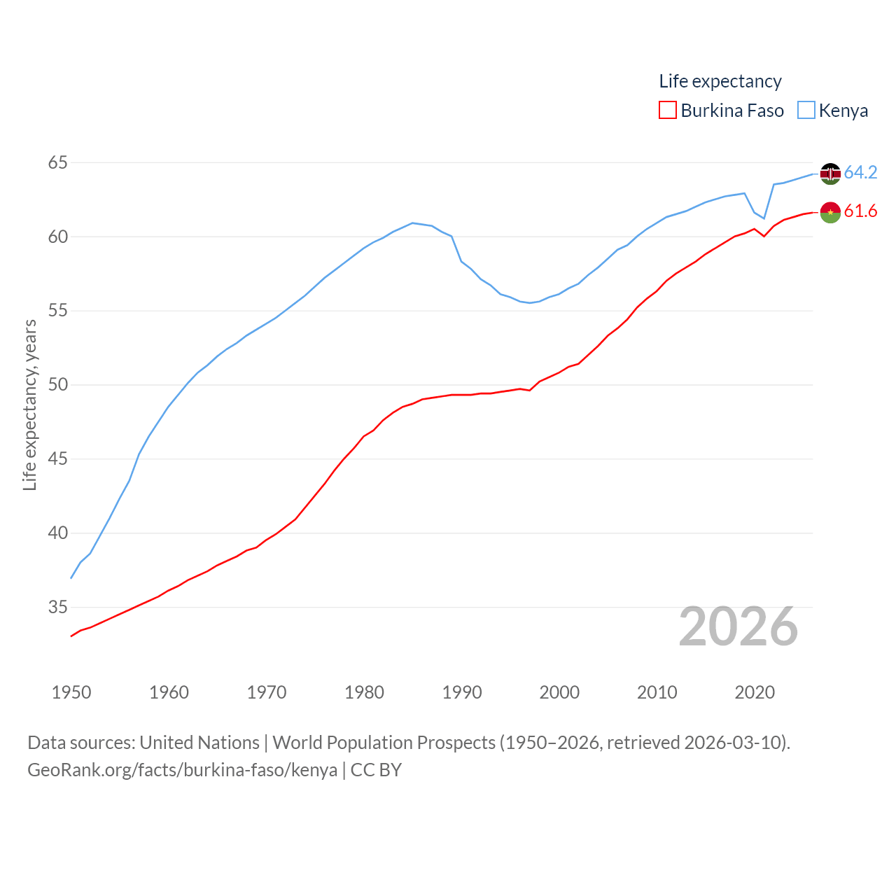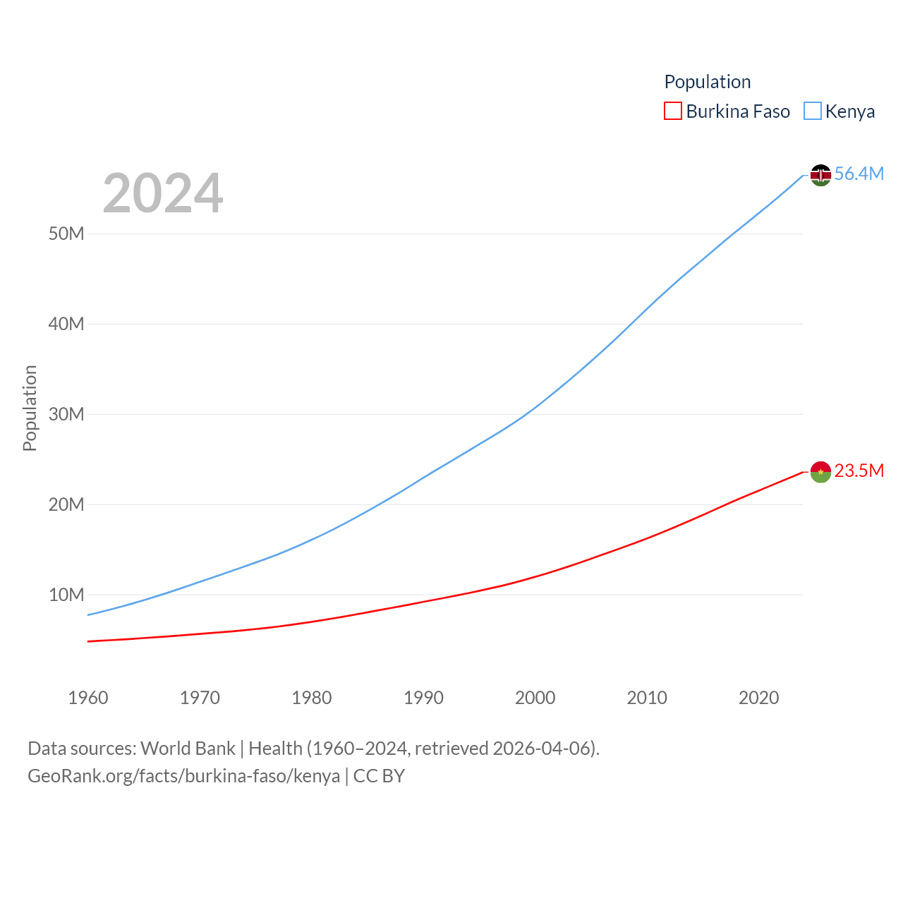 Burkina Faso has a population of 23.5M (ranked 59/197), compared with 56.4M in Kenya (ranked 26/197). Burkina Faso's land area is 105,638 sq mi versus 224,278 sq mi for Kenya (ranked 73rd vs. 45th).