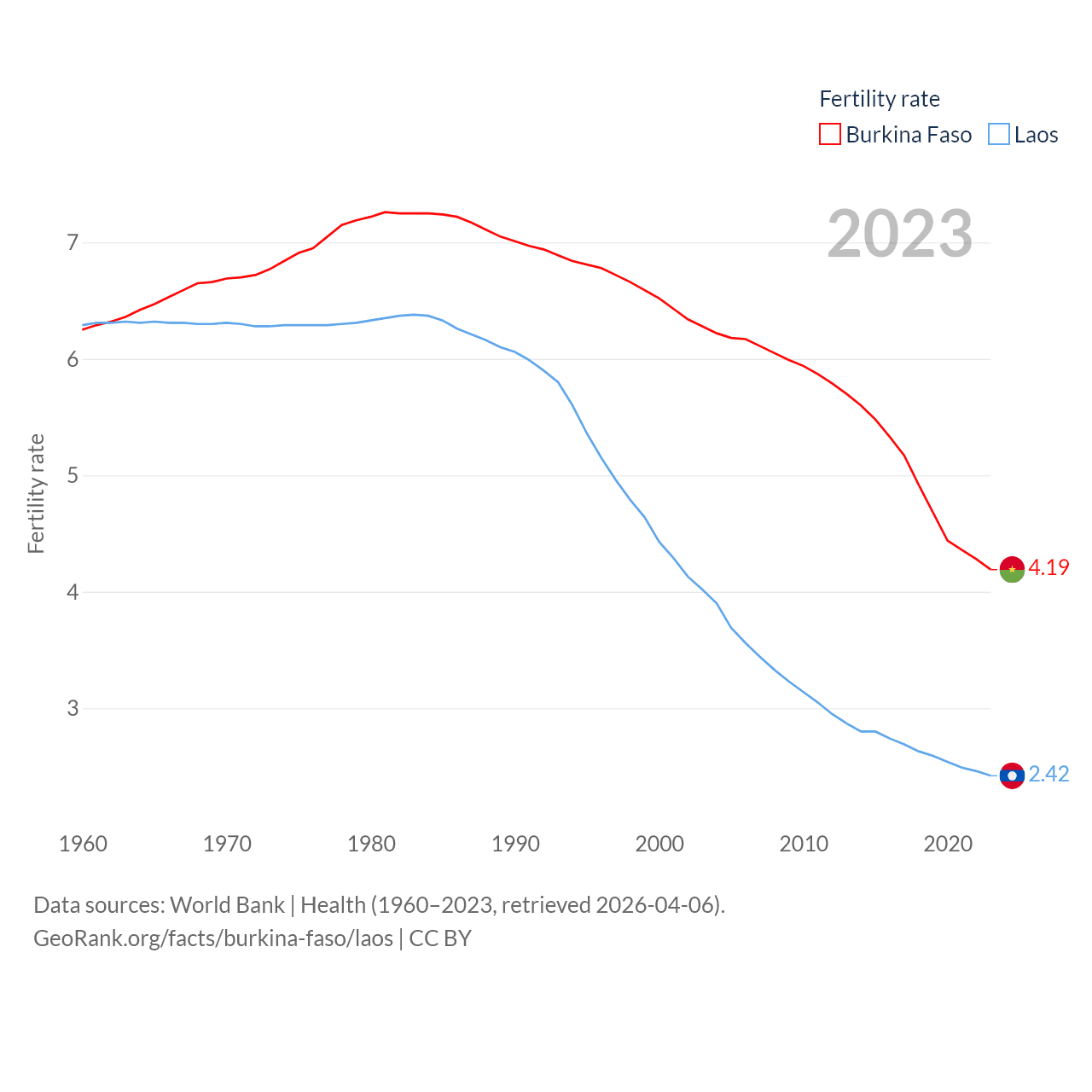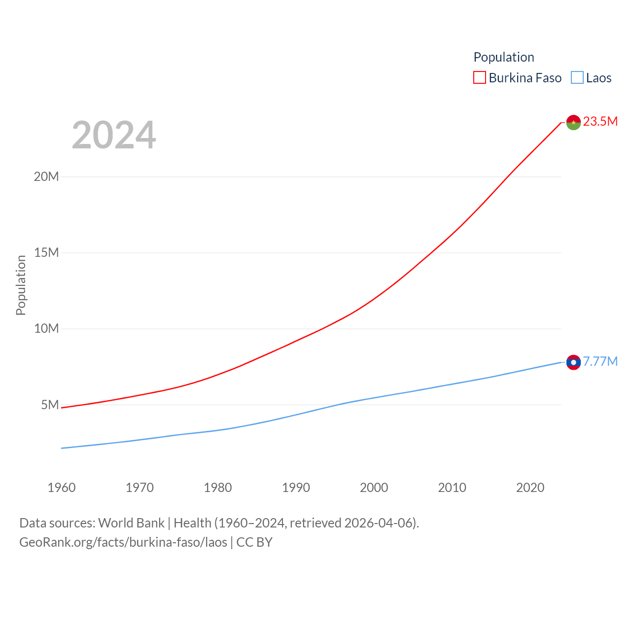 Burkina Faso has a population of 23.5M (ranked 59/197), compared with 7.77M in Laos (ranked 103/197). Burkina Faso's land area is 105,638 sq mi versus 89,112 sq mi for Laos (ranked 73rd vs. 79th).