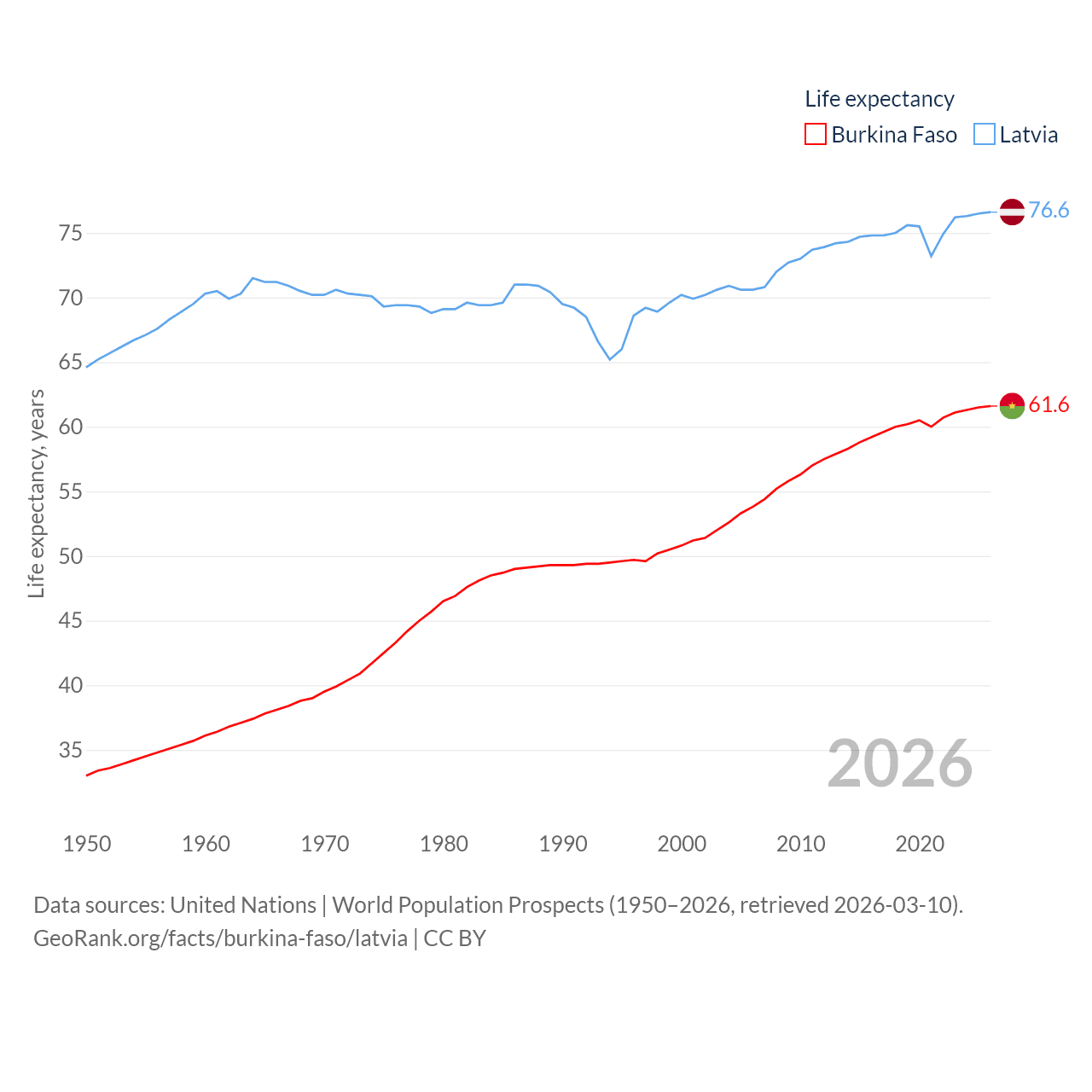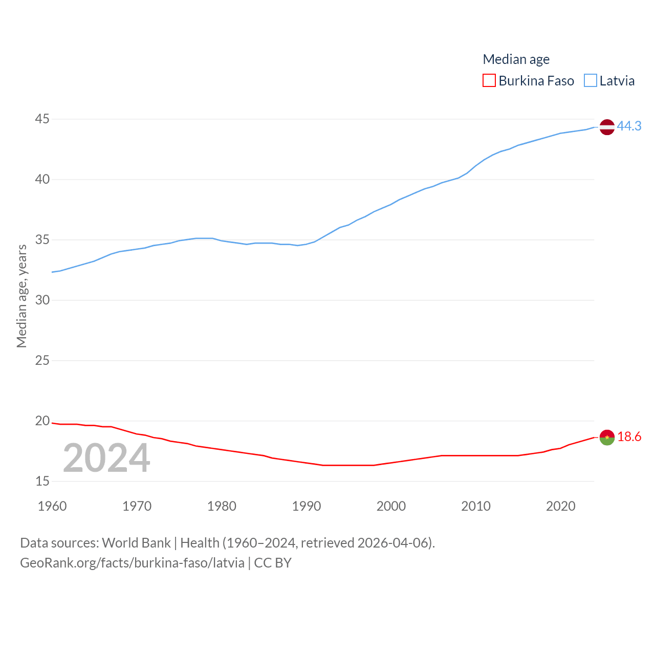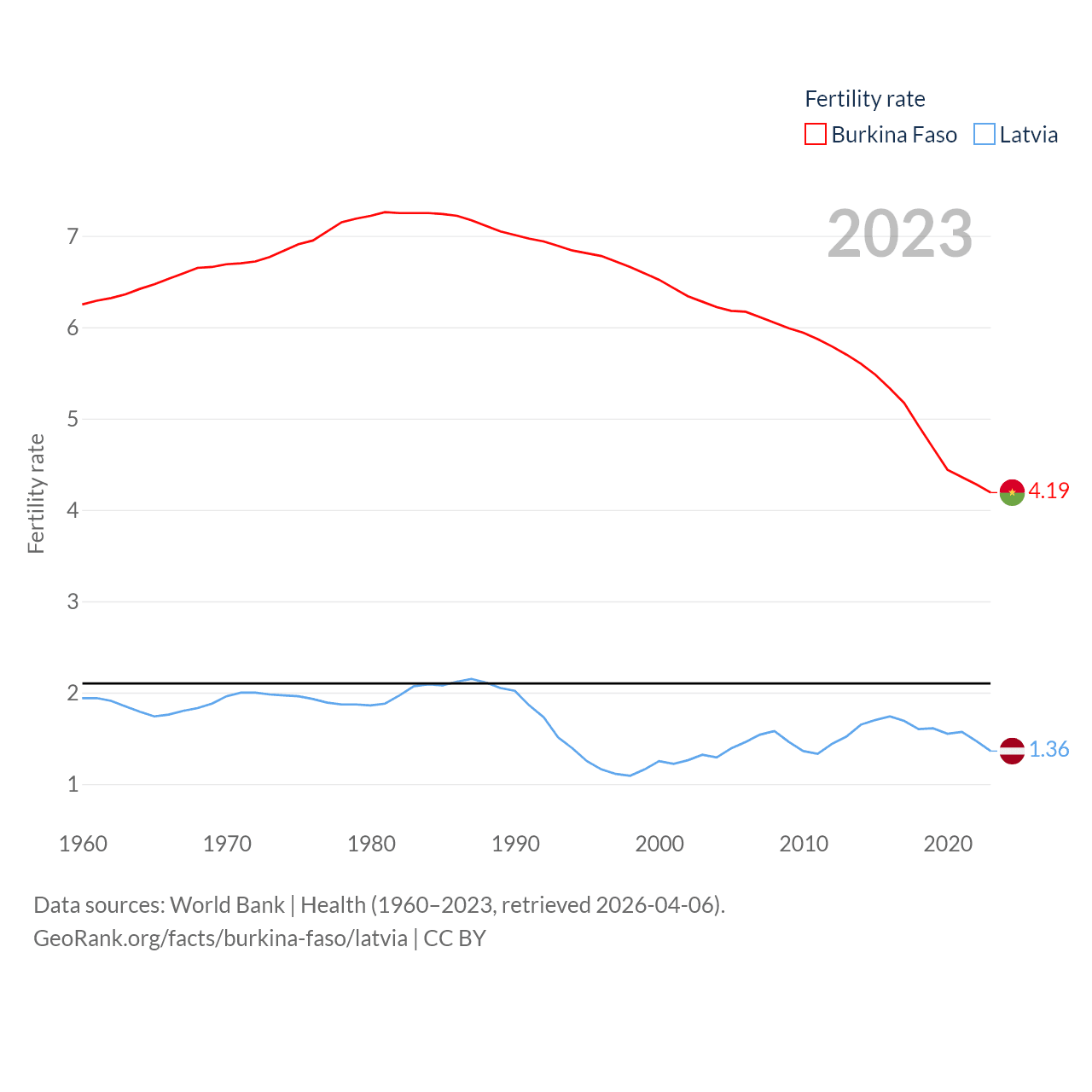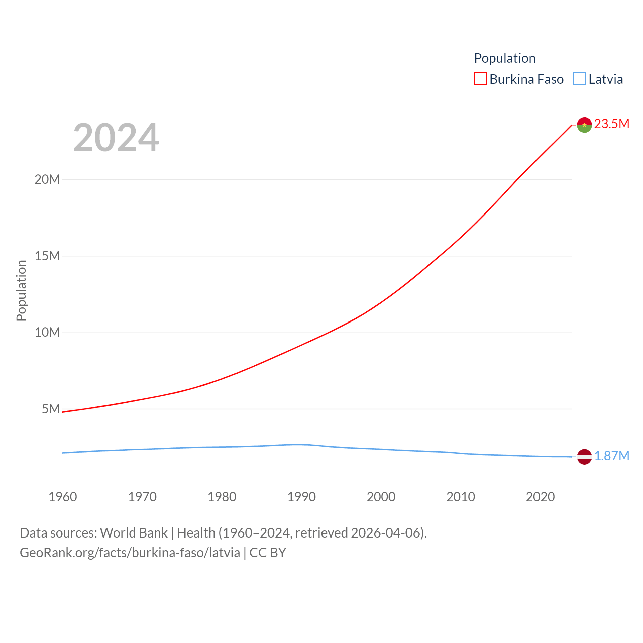 Burkina Faso has a population of 23.5M (ranked 59/197), compared with 1.87M in Latvia (ranked 149/197). Burkina Faso's land area is 105,638 sq mi versus 24,027 sq mi for Latvia (ranked 73rd vs. 121st).
