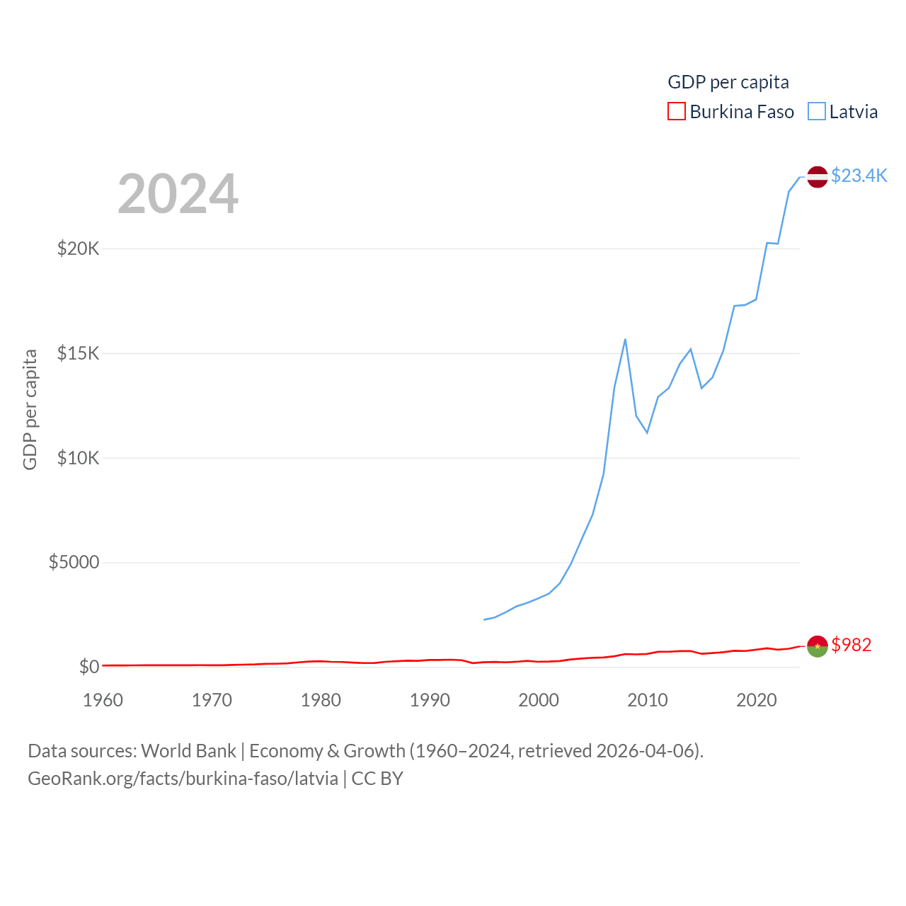 By GDP, Burkina Faso ranks 122/197 ($23.1B) and Latvia ranks 99/197 ($43.7B). By GDP per capita, Burkina Faso ranks 180/197 ($982), while Latvia ranks 54/197 ($23,409).
