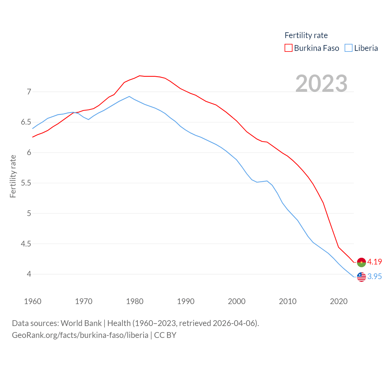 Burkina Faso has a population of 23.5M (ranked 59/197), compared with 5.61M in Liberia (ranked 117/197). Burkina Faso's land area is 105,638 sq mi versus 37,189 sq mi for Liberia (ranked 73rd vs. 106th).