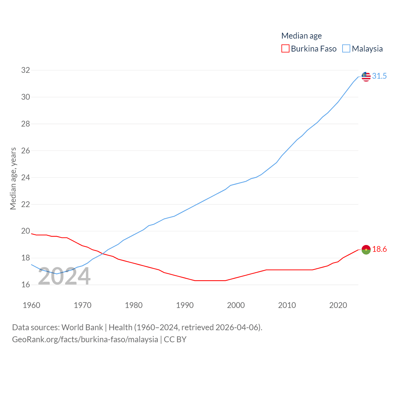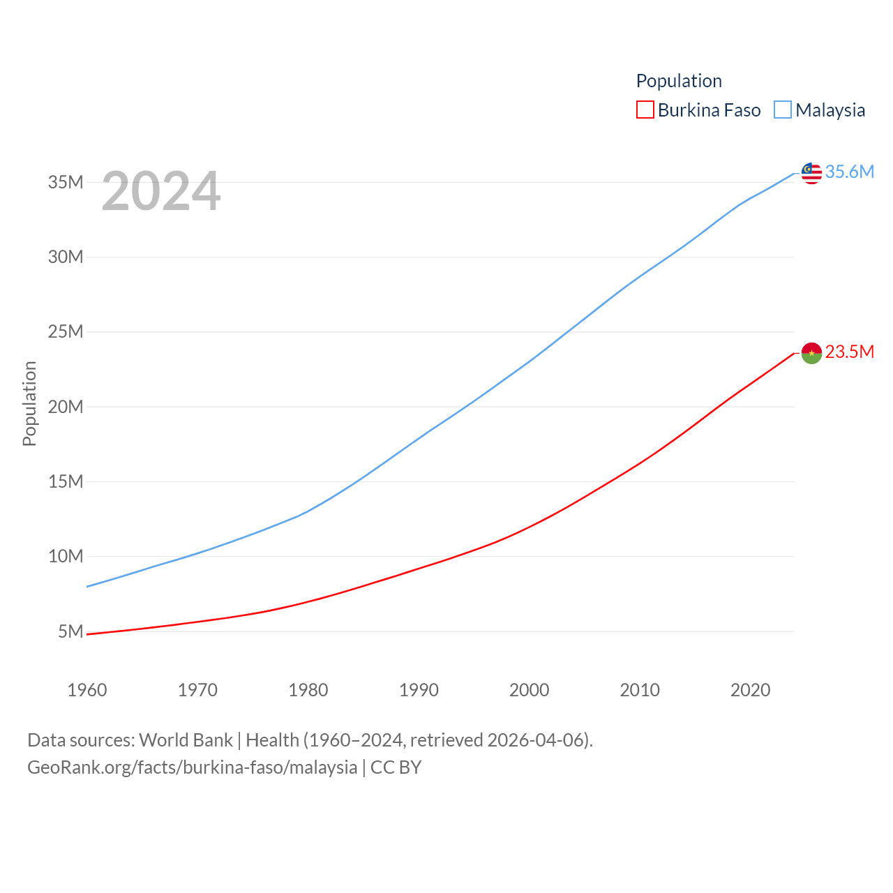 Burkina Faso has a population of 23.5M (ranked 59/197), compared with 35.6M in Malaysia (ranked 44/197). Burkina Faso's land area is 105,638 sq mi versus 126,854 sq mi for Malaysia (ranked 73rd vs. 65th).