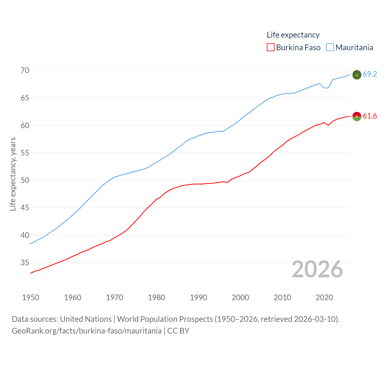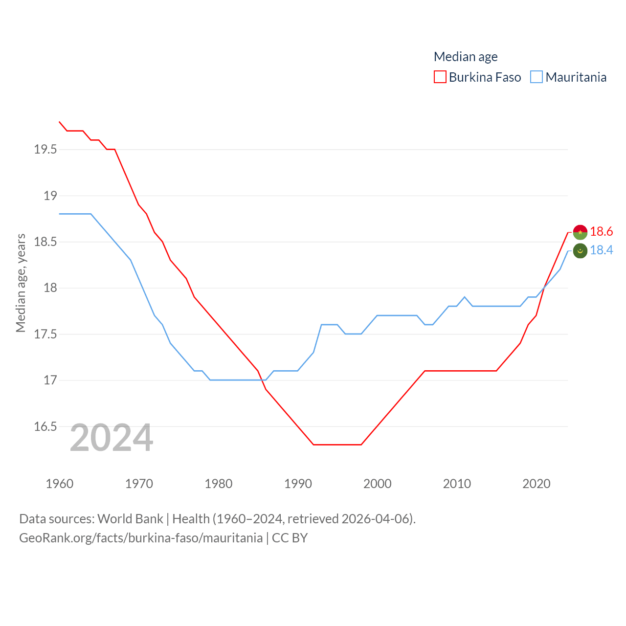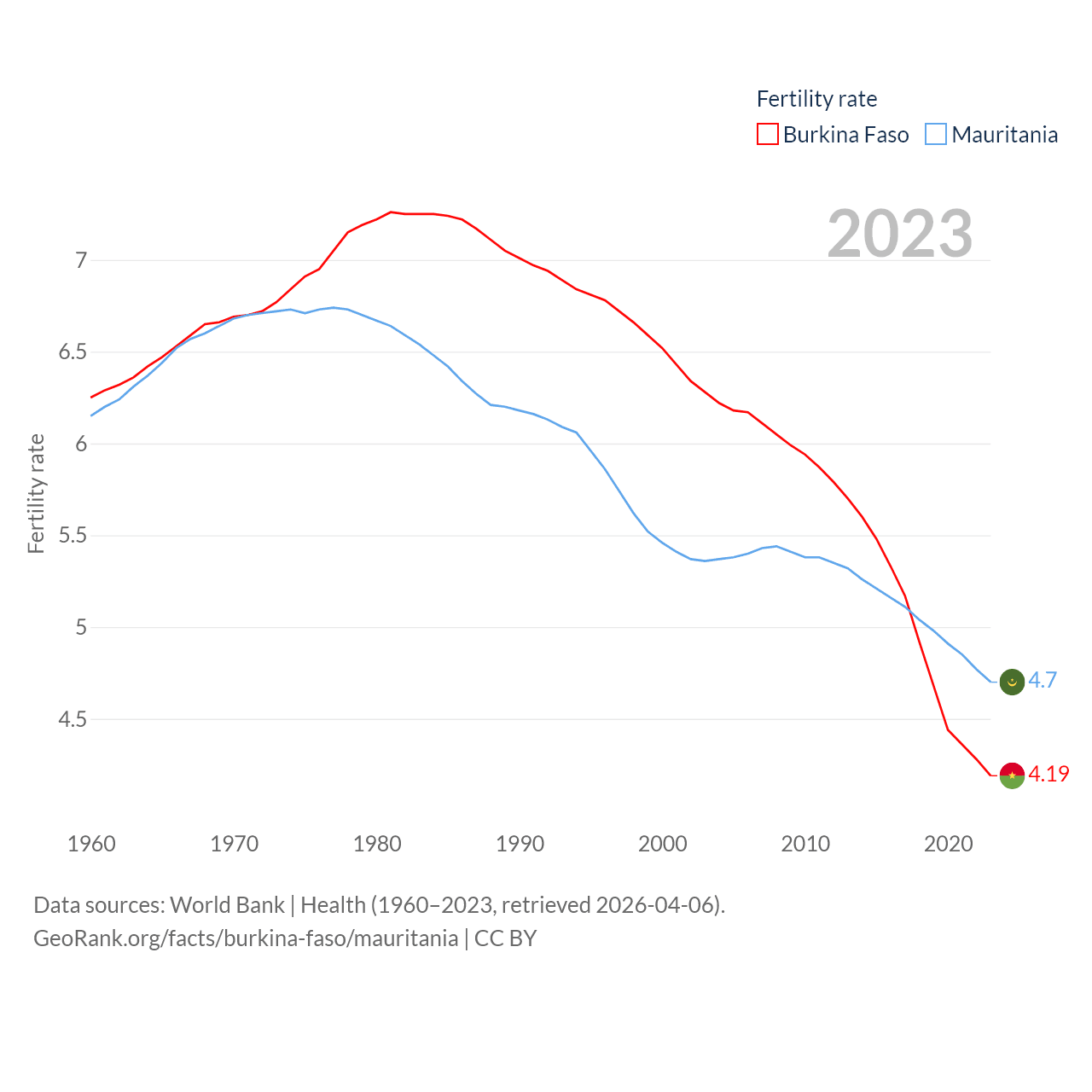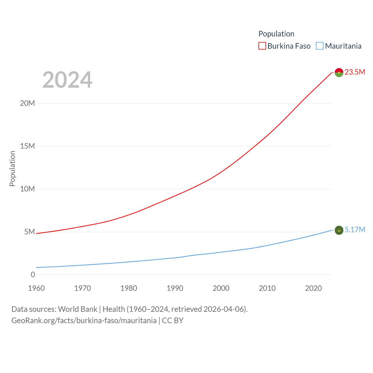 Burkina Faso has a population of 23.5M (ranked 59/197), compared with 5.17M in Mauritania (ranked 125/197). Burkina Faso's land area is 105,638 sq mi versus 397,955 sq mi for Mauritania (ranked 73rd vs. 28th).