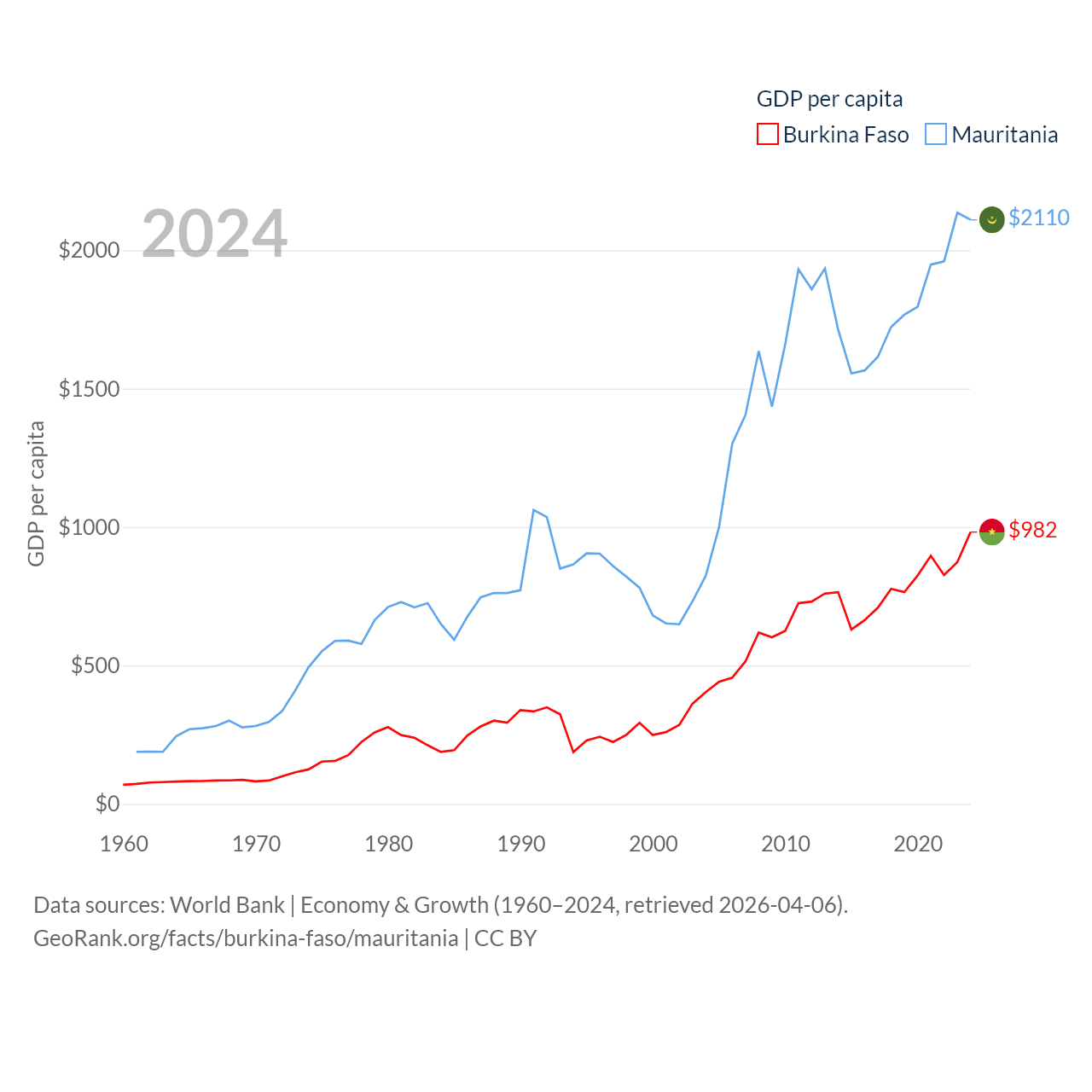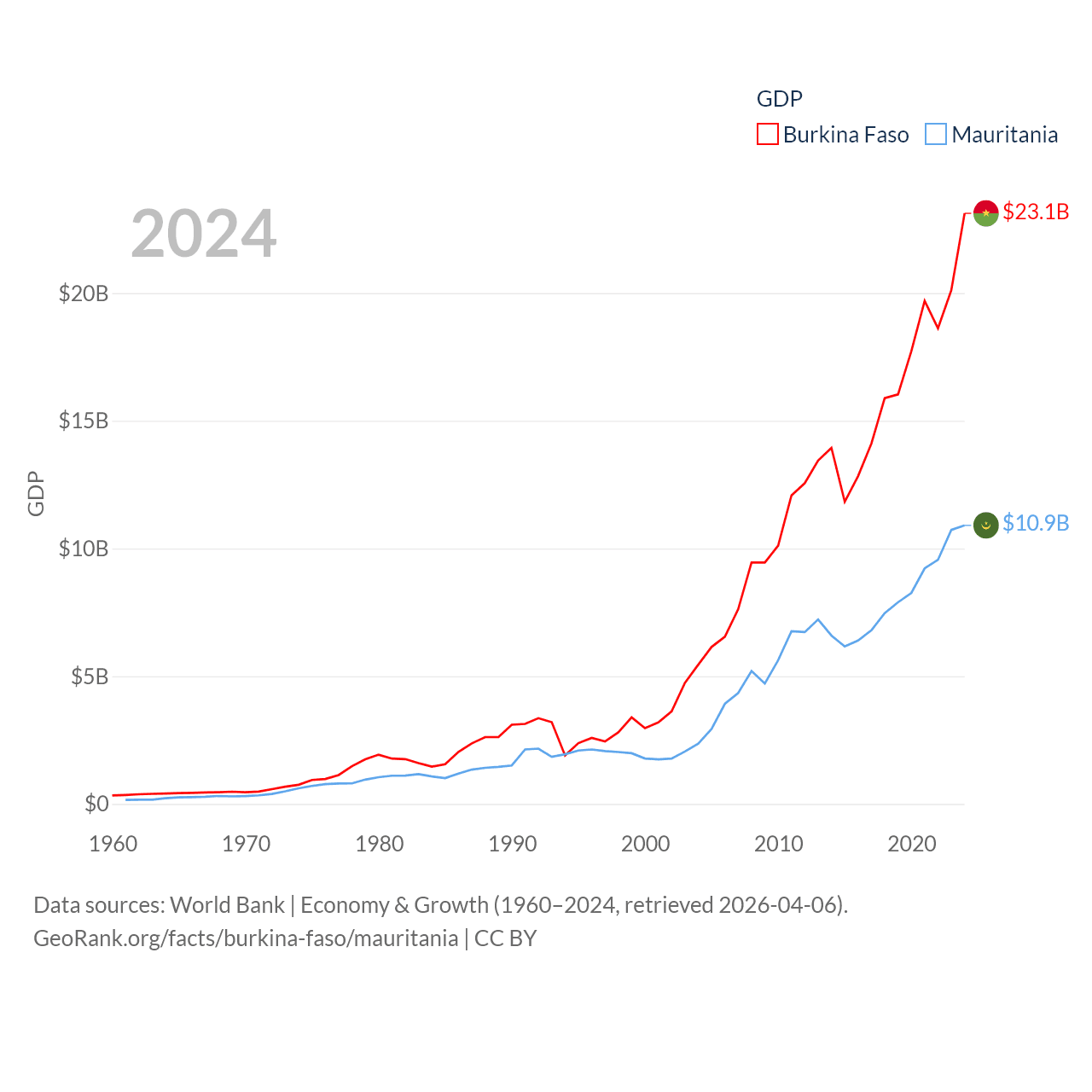 By GDP, Burkina Faso ranks 122/197 ($23.1B) and Mauritania ranks 153/197 ($10.9B). By GDP per capita, Burkina Faso ranks 180/197 ($982), while Mauritania ranks 156/197 ($2,110).