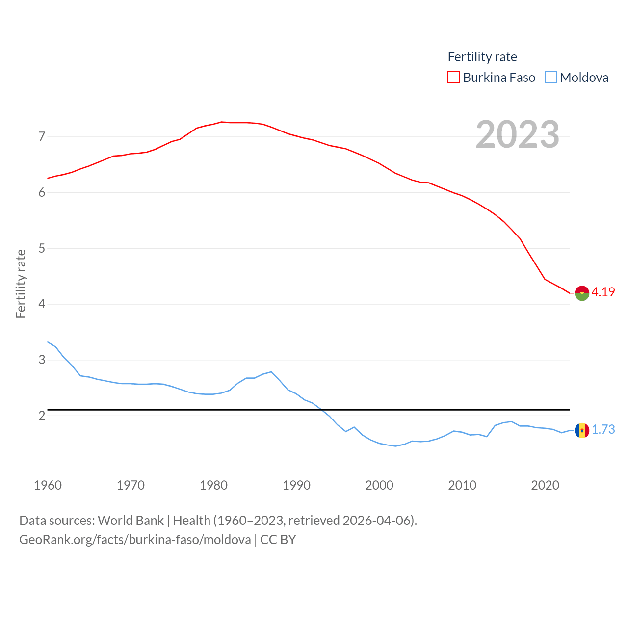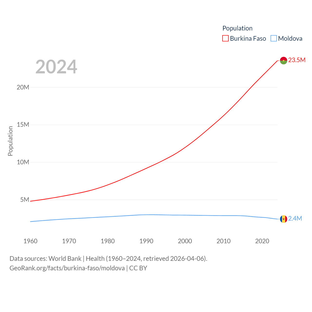 Burkina Faso has a population of 23.5M (ranked 59/197), compared with 2.4M in Moldova (ranked 143/197). Burkina Faso's land area is 105,638 sq mi versus 12,714 sq mi for Moldova (ranked 73rd vs. 135th).