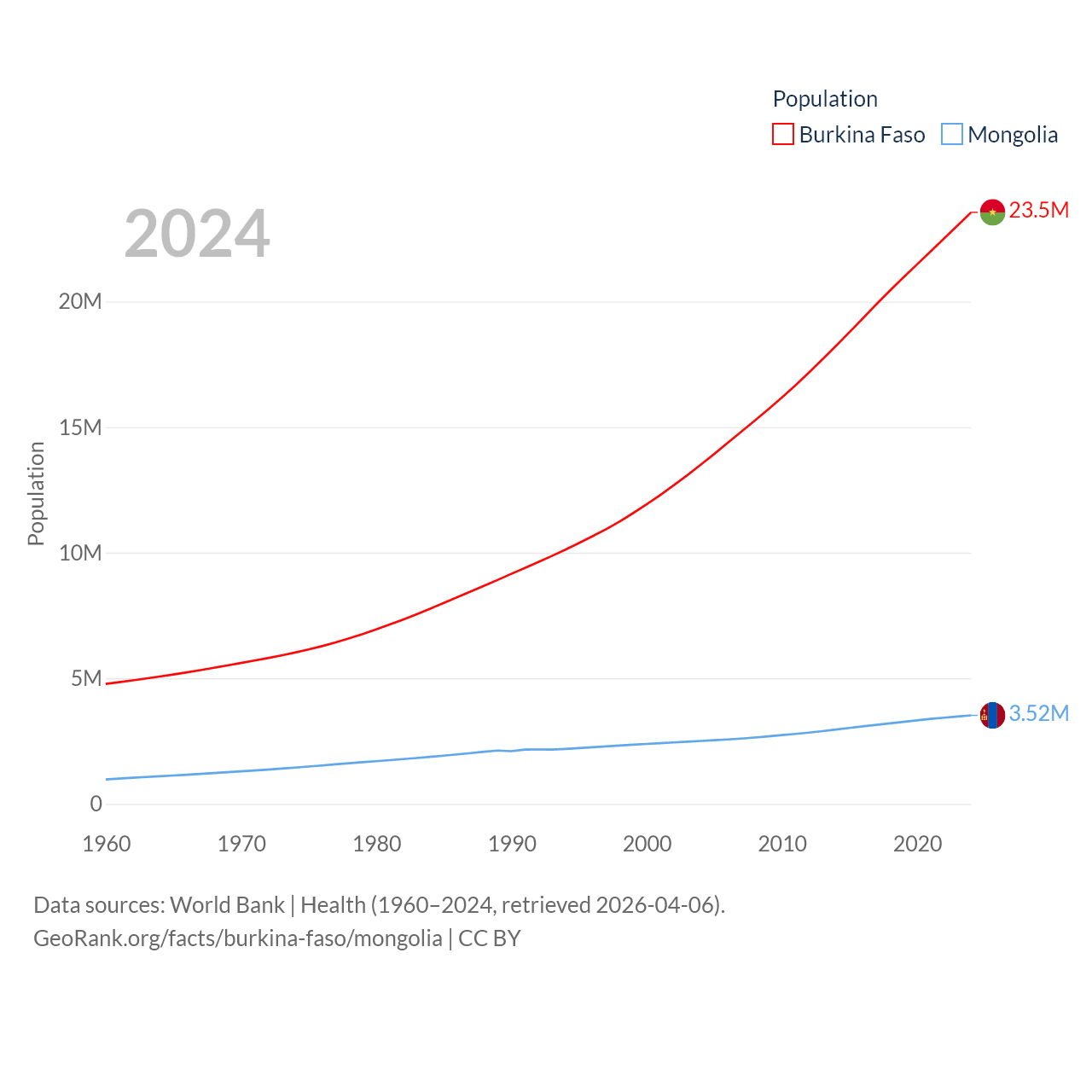 Burkina Faso has a population of 23.5M (ranked 59/197), compared with 3.52M in Mongolia (ranked 132/197). Burkina Faso's land area is 105,638 sq mi versus 601,740 sq mi for Mongolia (ranked 73rd vs. 18th).