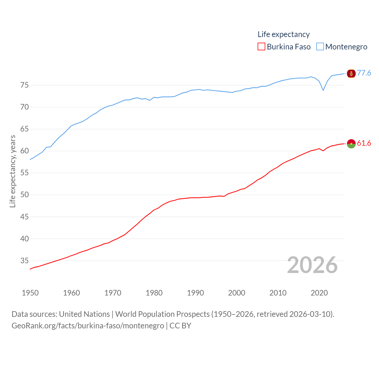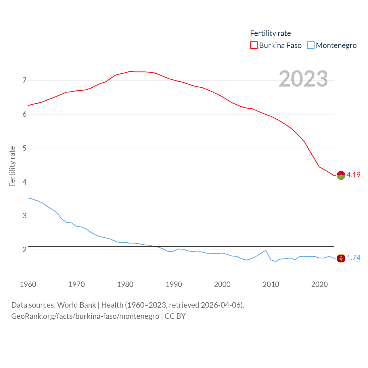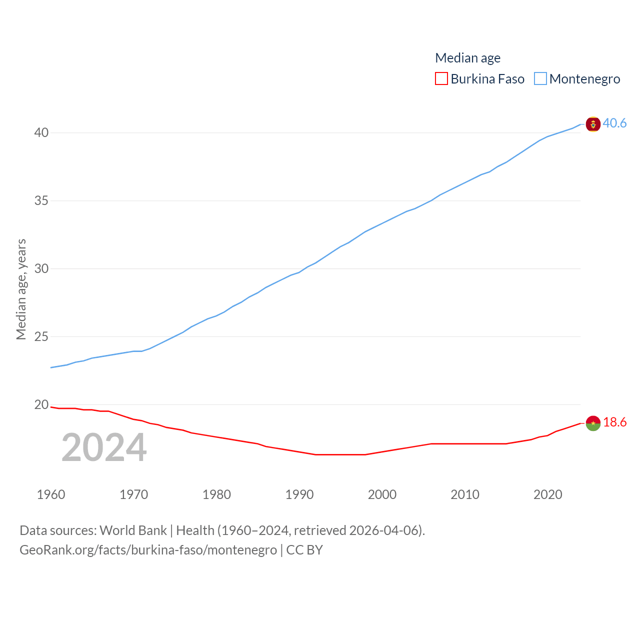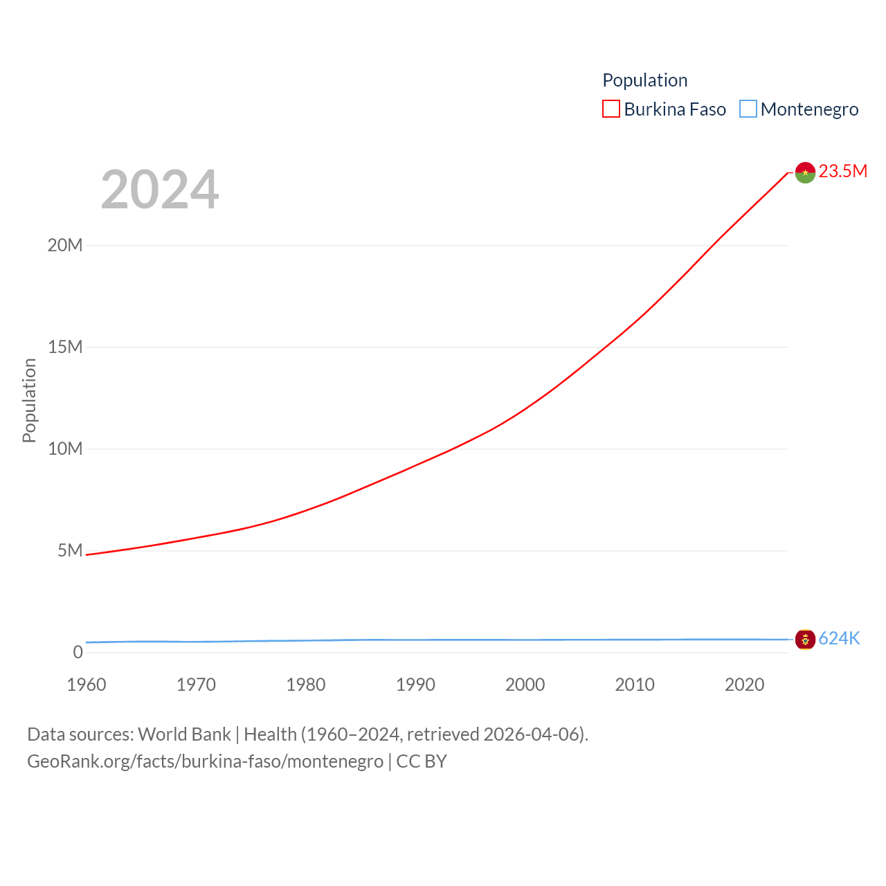 Burkina Faso has a population of 23.5M (ranked 59/197), compared with 624K in Montenegro (ranked 166/197). Burkina Faso's land area is 105,638 sq mi versus 5,193 sq mi for Montenegro (ranked 73rd vs. 156th).