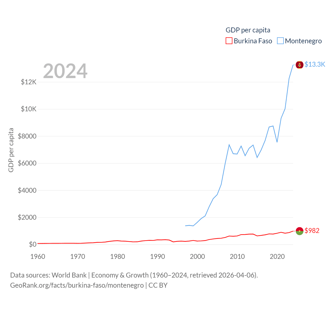 By GDP, Burkina Faso ranks 122/197 ($23.1B) and Montenegro ranks 155/197 ($8.27B). By GDP per capita, Burkina Faso ranks 180/197 ($982), while Montenegro ranks 77/197 ($13,263).