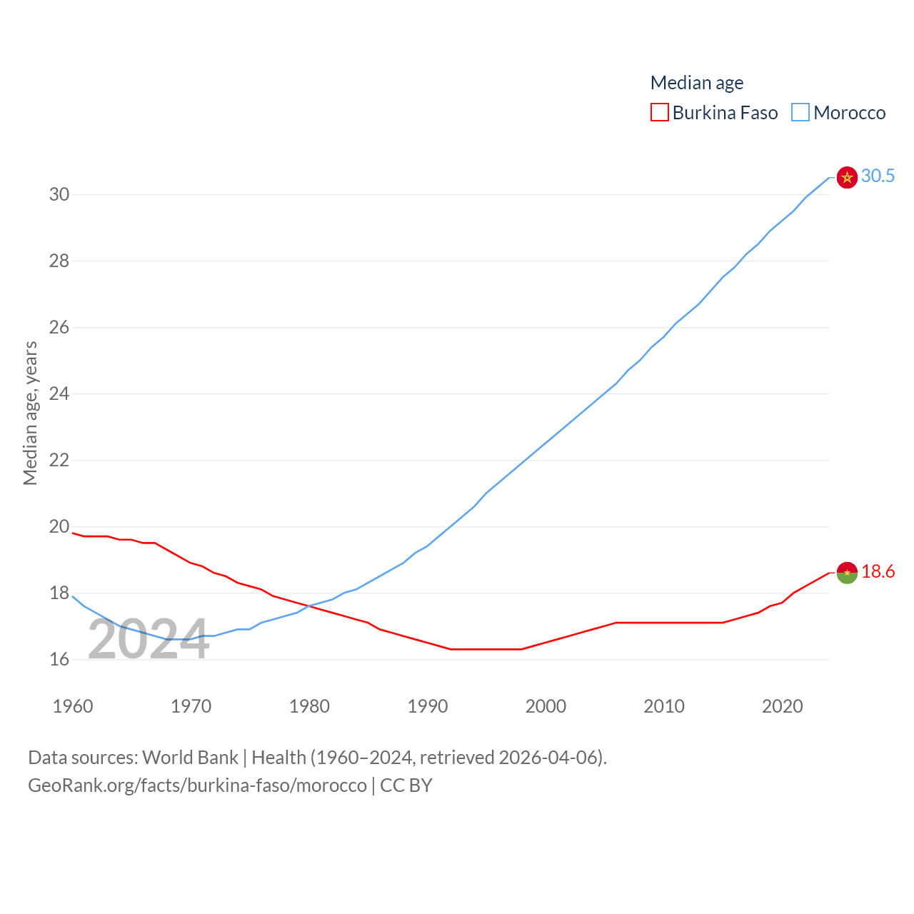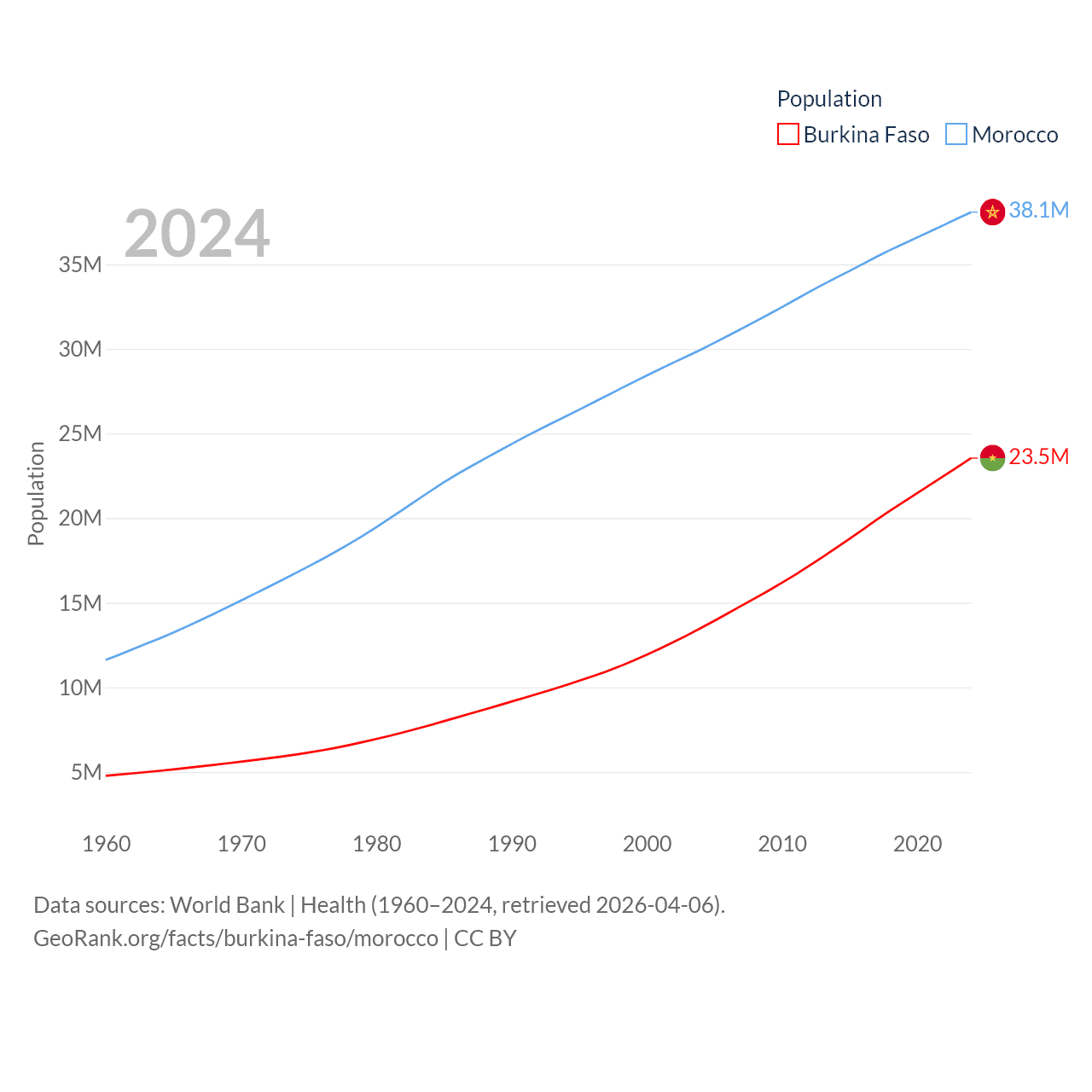 Burkina Faso has a population of 23.5M (ranked 59/197), compared with 38.1M in Morocco (ranked 39/197). Burkina Faso's land area is 105,638 sq mi versus 172,317 sq mi for Morocco (ranked 73rd vs. 55th).