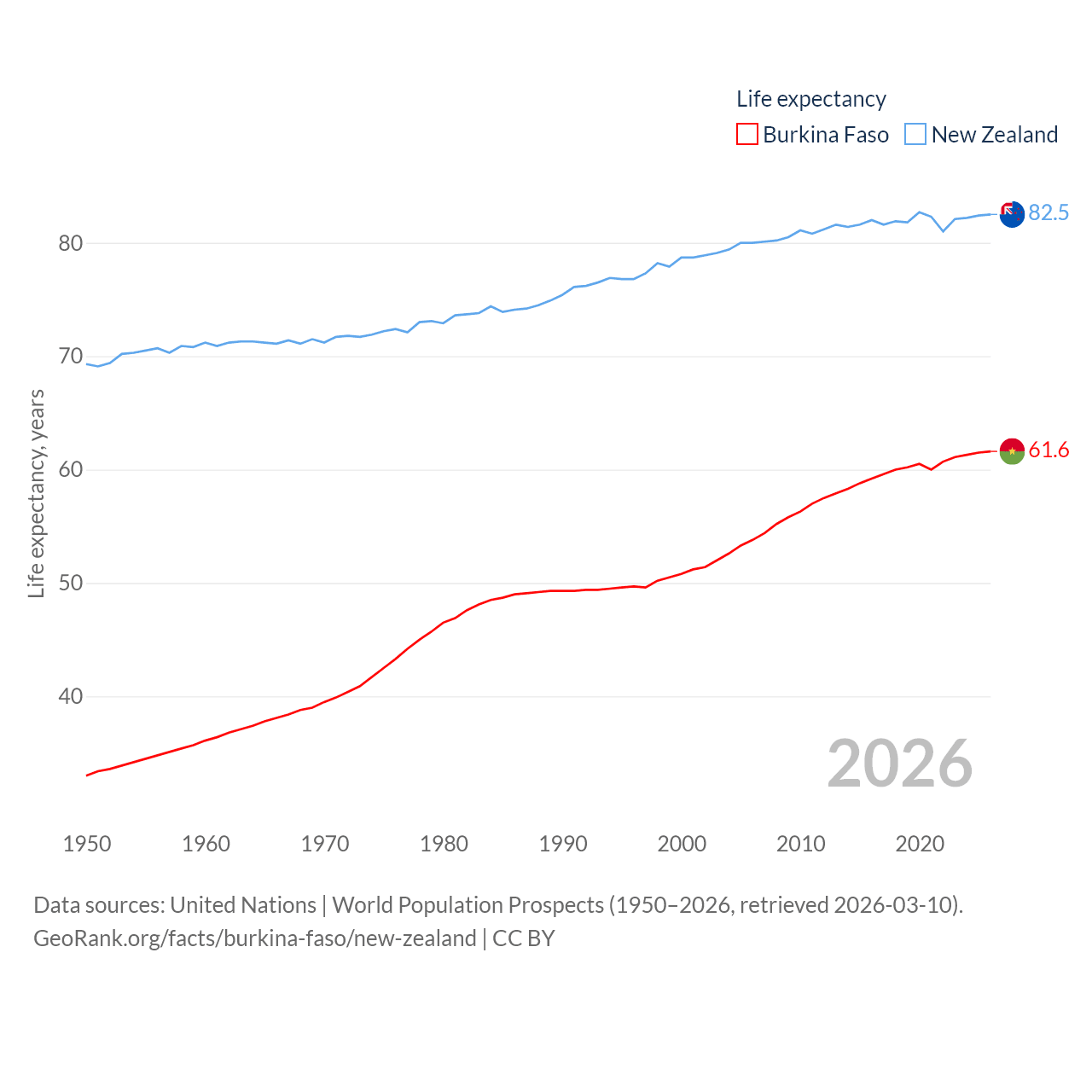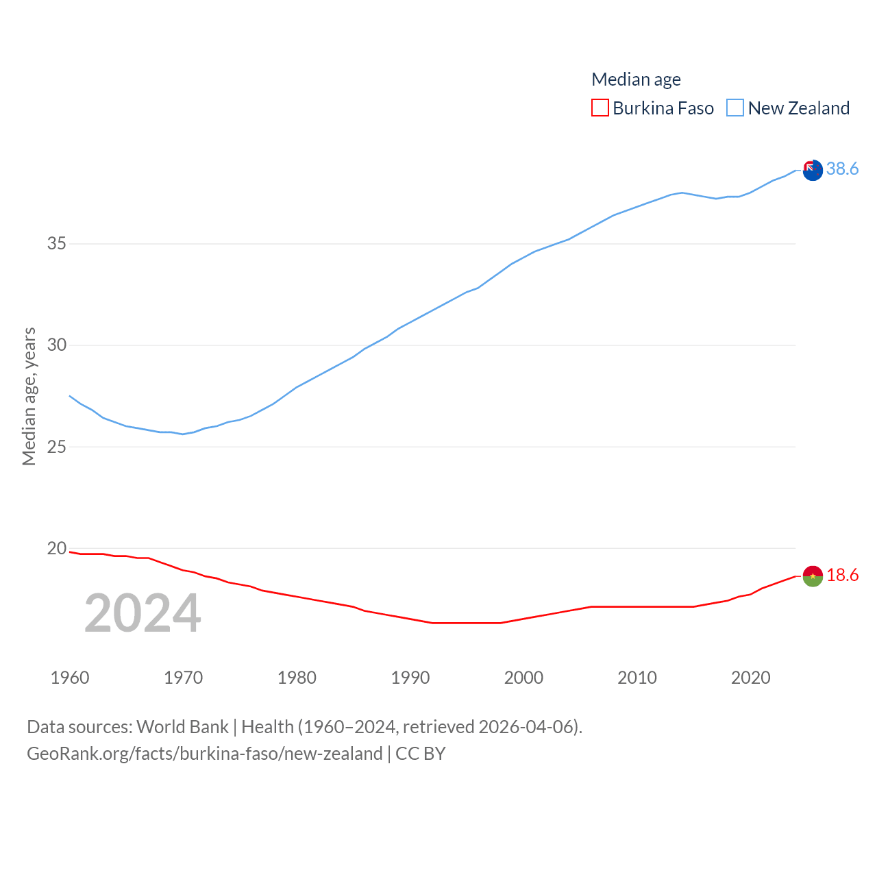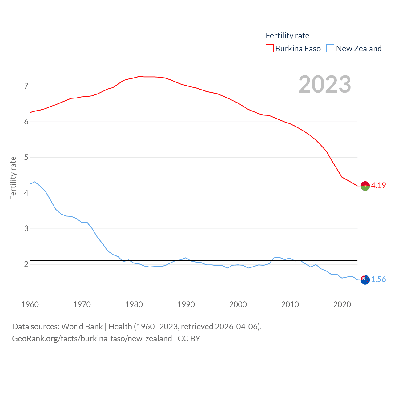 Burkina Faso has a population of 23.5M (ranked 59/197), compared with 5.29M in New Zealand (ranked 123/197). Burkina Faso's land area is 105,638 sq mi versus 101,665 sq mi for New Zealand (ranked 73rd vs. 74th).