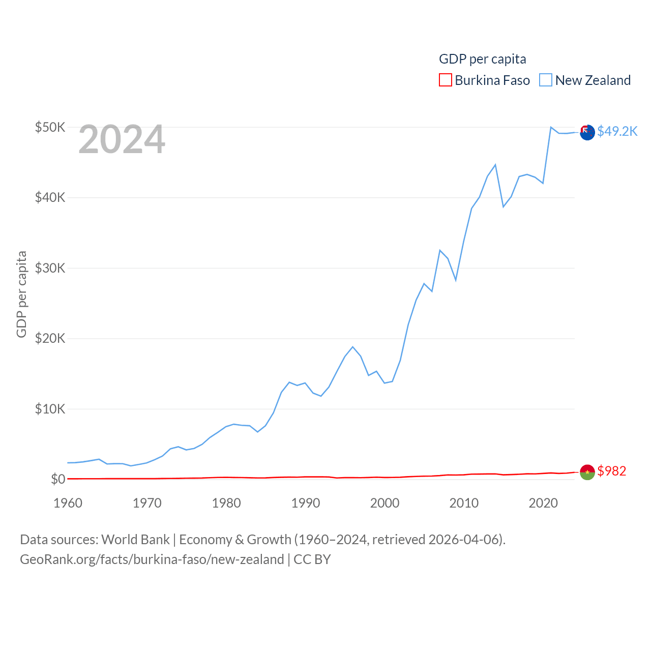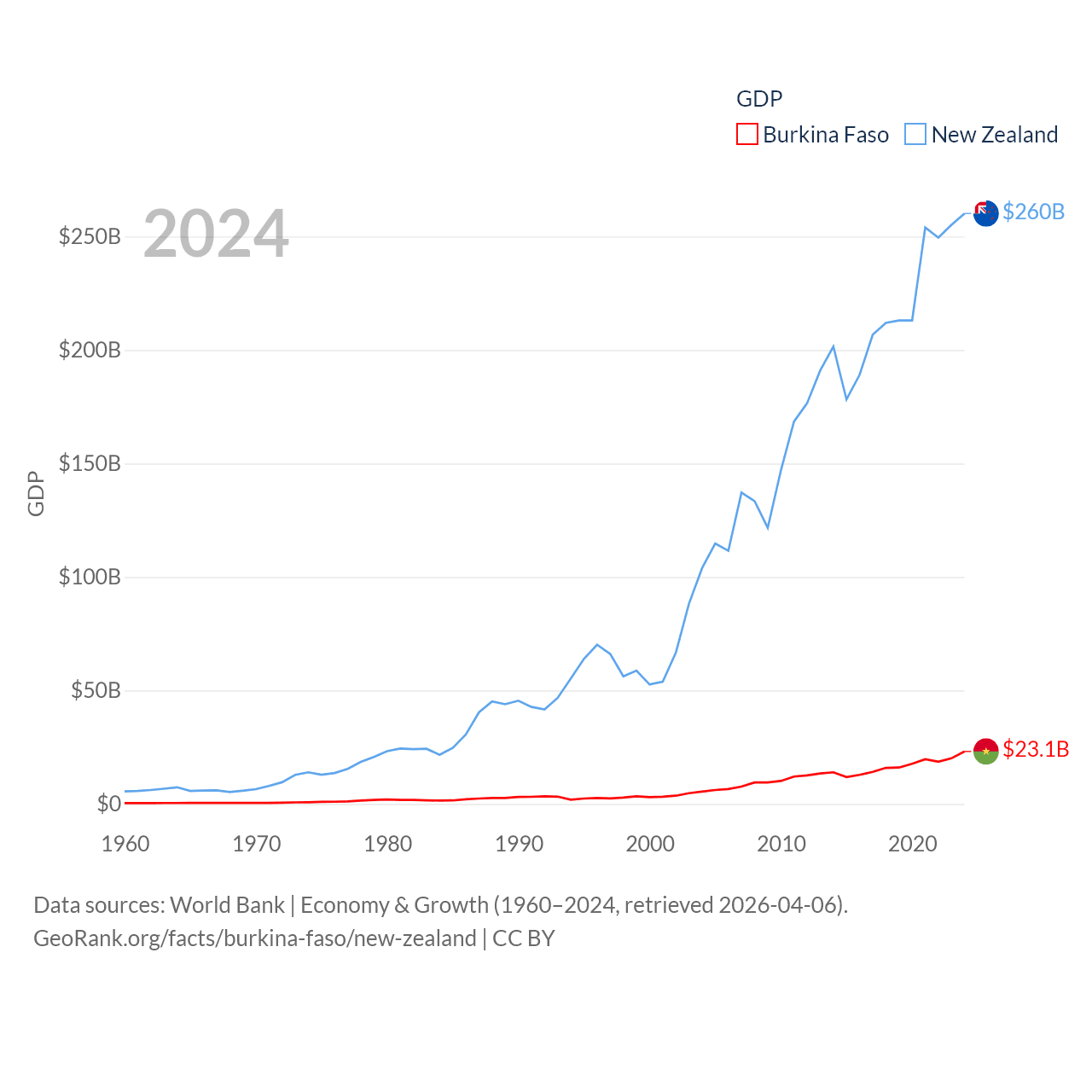 By GDP, Burkina Faso ranks 122/197 ($23.1B) and New Zealand ranks 52/197 ($260B). By GDP per capita, Burkina Faso ranks 180/197 ($982), while New Zealand ranks 26/197 ($49,205).
