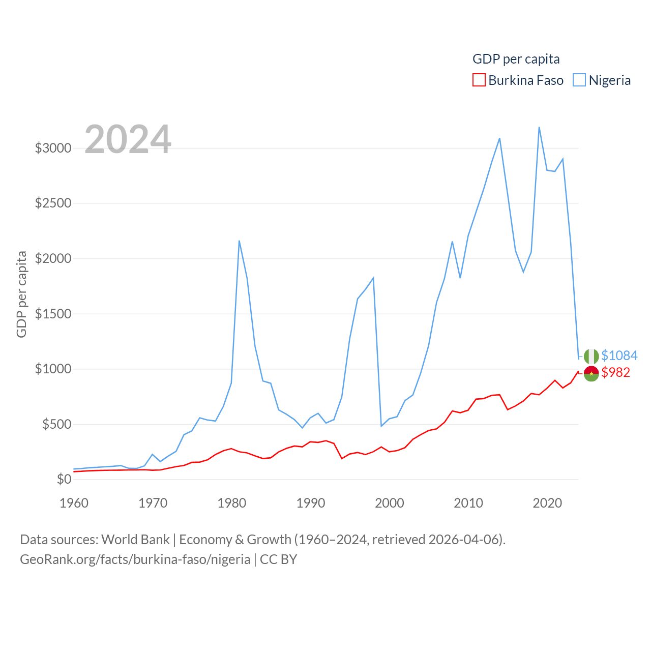 By GDP, Burkina Faso ranks 122/197 ($23.1B) and Nigeria ranks 54/197 ($252B). By GDP per capita, Burkina Faso ranks 180/197 ($982), while Nigeria ranks 174/197 ($1,084).
