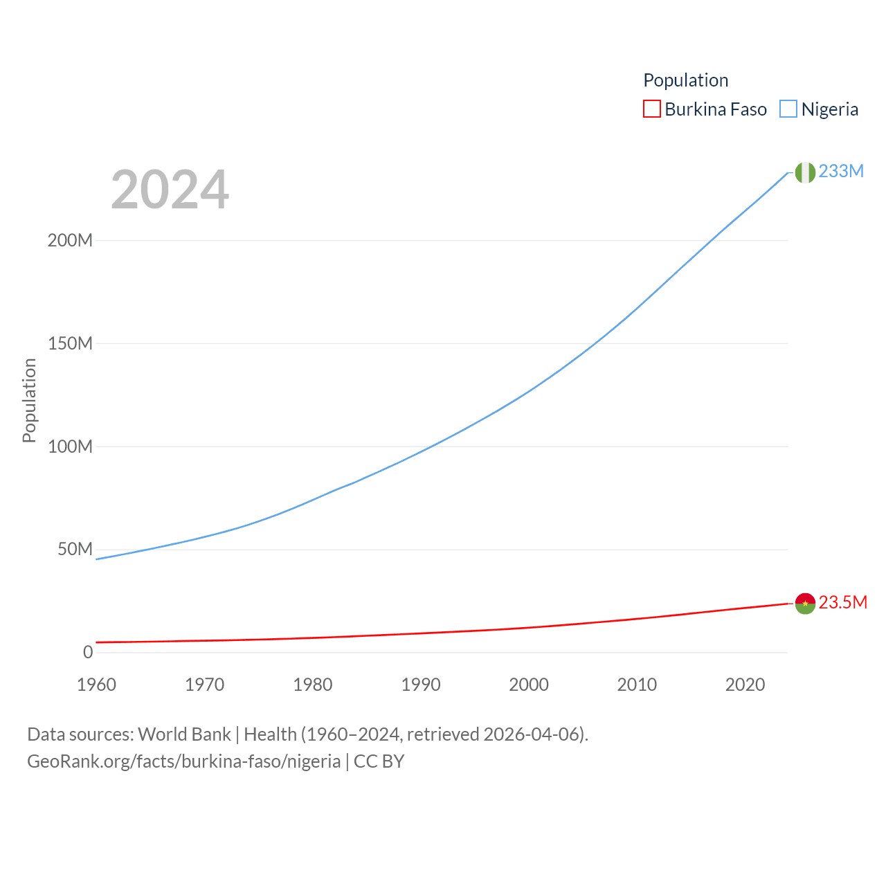 Burkina Faso has a population of 23.5M (ranked 59/197), compared with 233M in Nigeria (ranked 6/197). Burkina Faso's land area is 105,638 sq mi versus 351,650 sq mi for Nigeria (ranked 73rd vs. 30th).