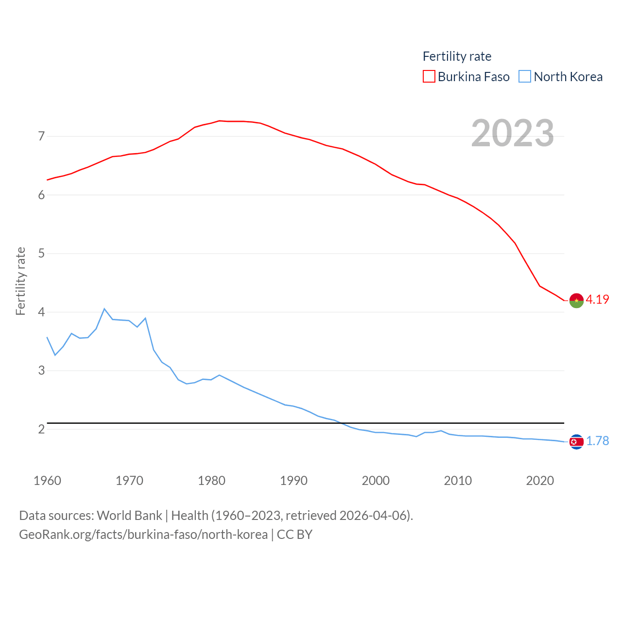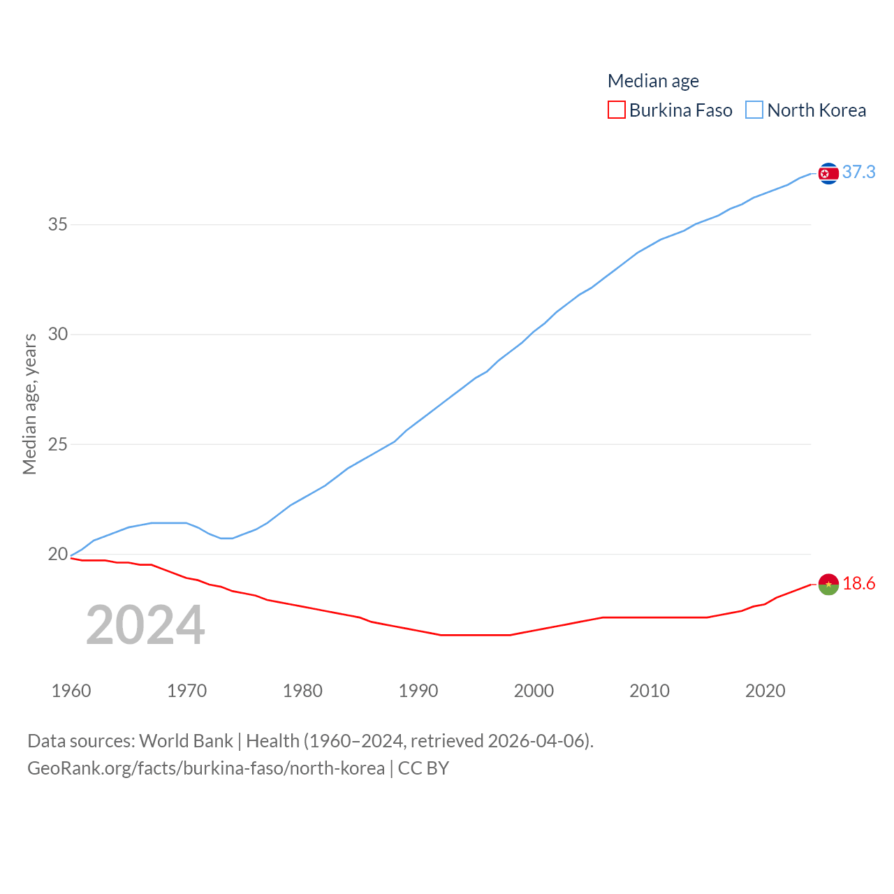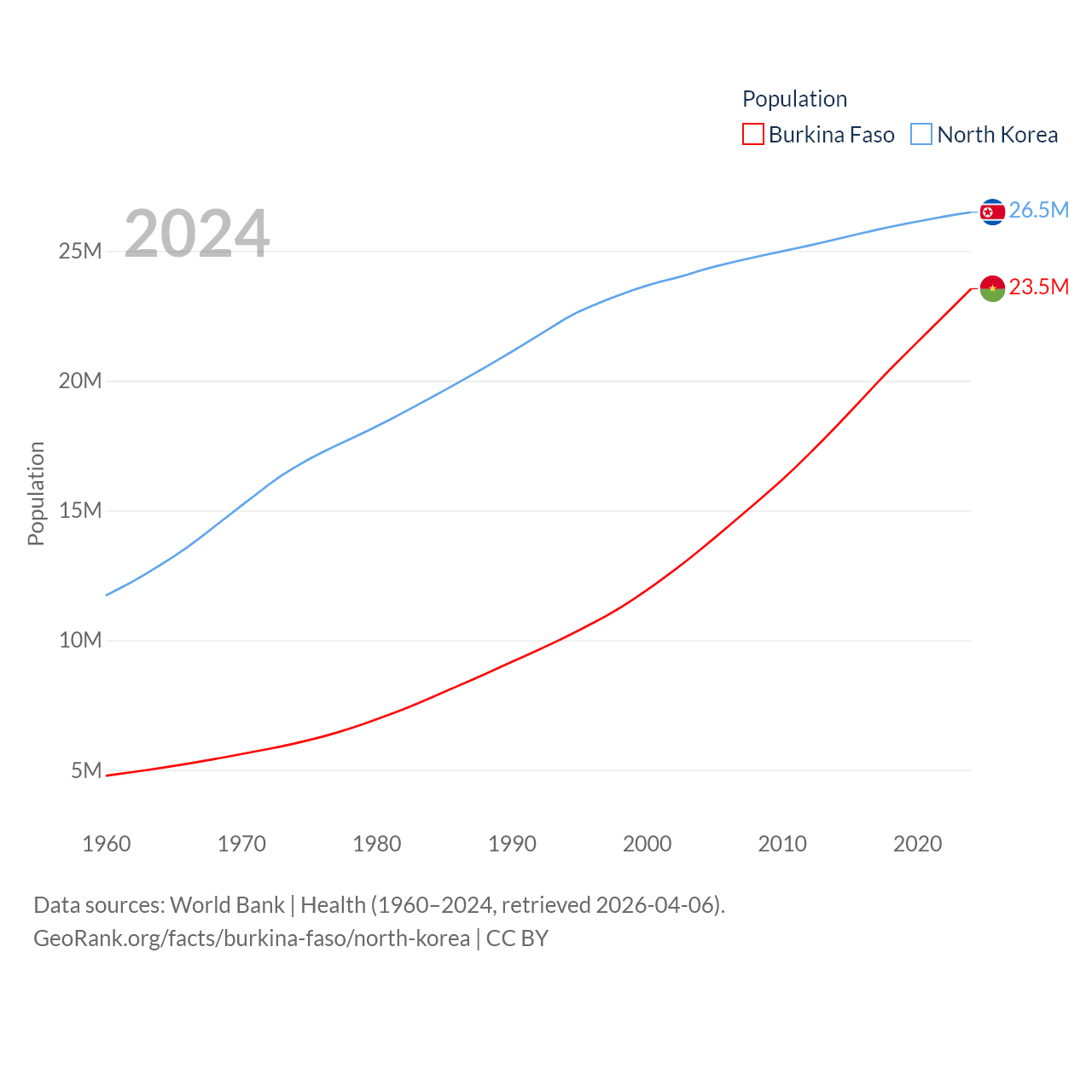 Burkina Faso has a population of 23.5M (ranked 59/197), compared with 26.5M in North Korea (ranked 56/197). Burkina Faso's land area is 105,638 sq mi versus 46,491 sq mi for North Korea (ranked 73rd vs. 97th).