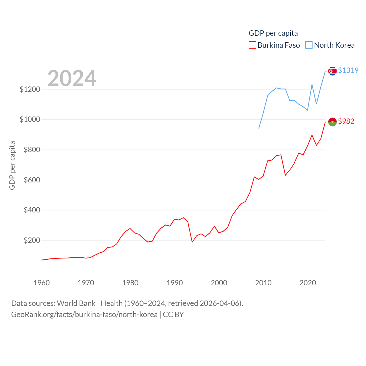 By GDP, Burkina Faso ranks 122/197 ($23.1B) and North Korea ranks 106/197 ($34.9B). By GDP per capita, Burkina Faso ranks 180/197 ($982), while North Korea ranks 168/197 ($1,319).