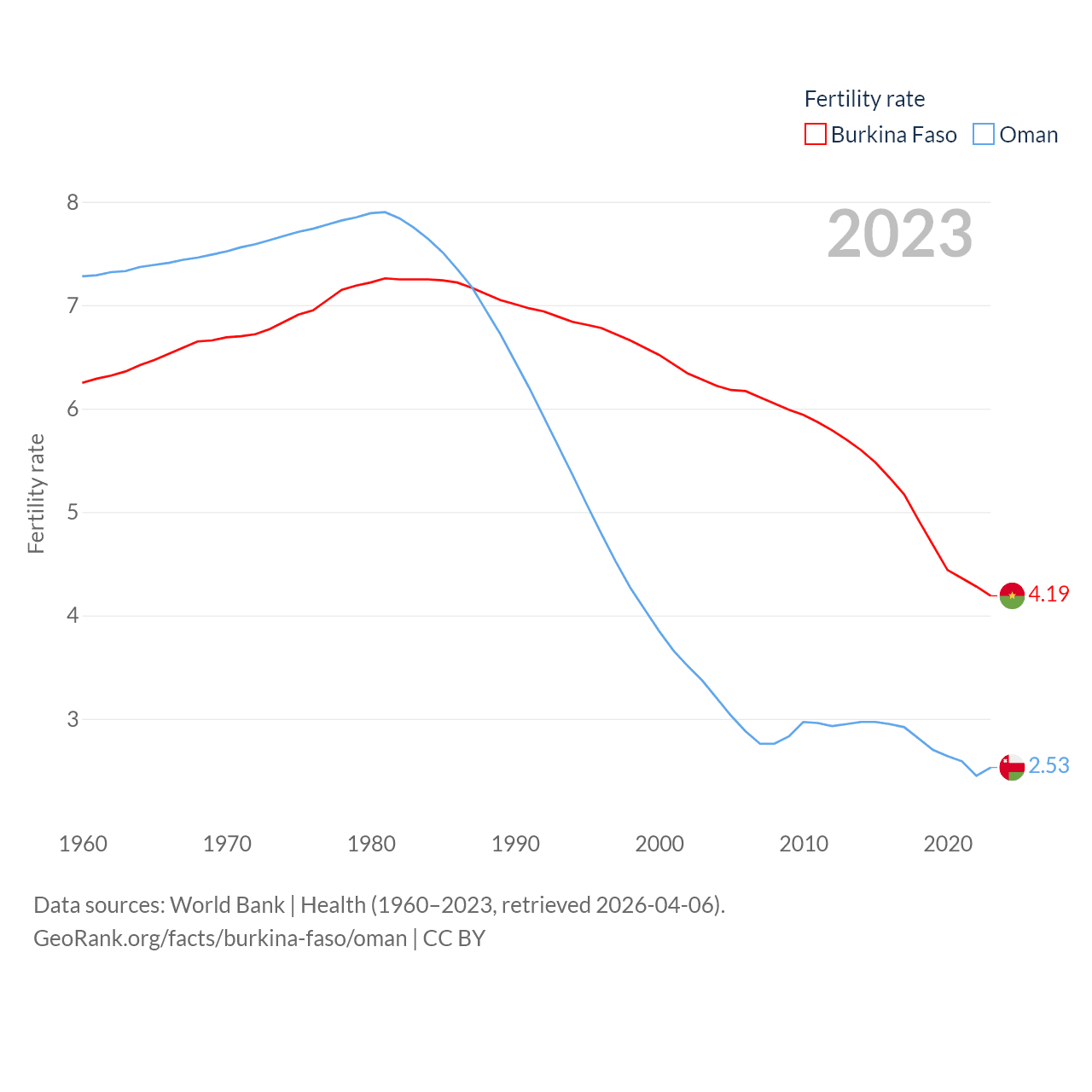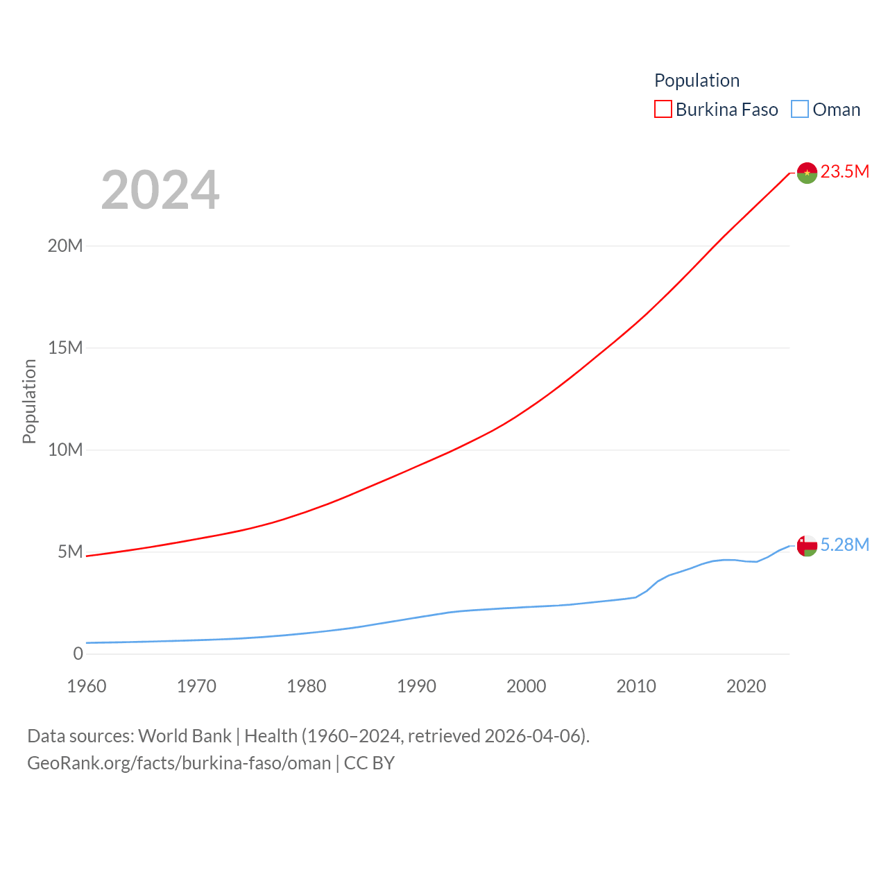 Burkina Faso has a population of 23.5M (ranked 59/197), compared with 5.28M in Oman (ranked 124/197). Burkina Faso's land area is 105,638 sq mi versus 119,499 sq mi for Oman (ranked 73rd vs. 68th).