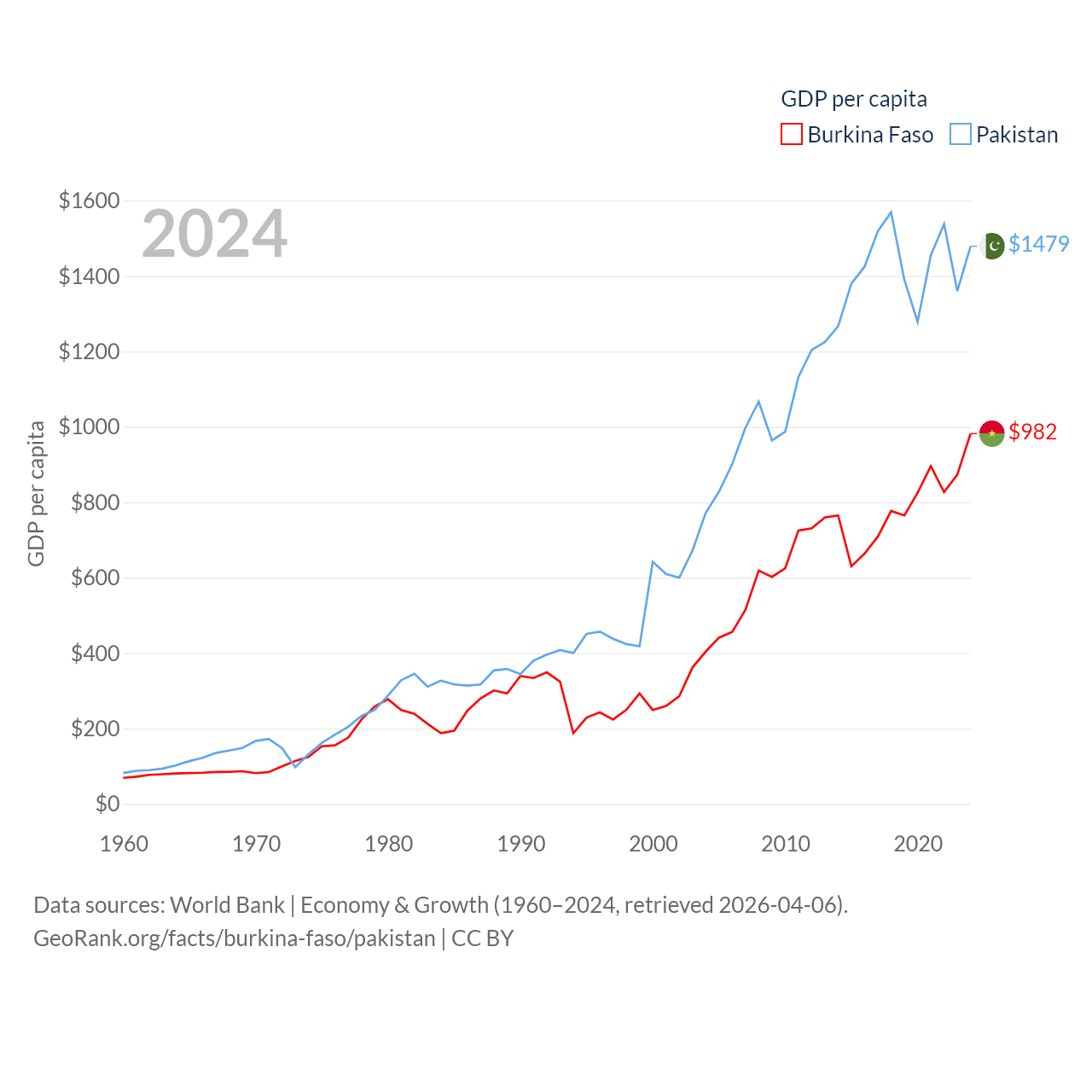 By GDP, Burkina Faso ranks 122/197 ($23.1B) and Pakistan ranks 43/197 ($372B). By GDP per capita, Burkina Faso ranks 180/197 ($982), while Pakistan ranks 163/197 ($1,479).
