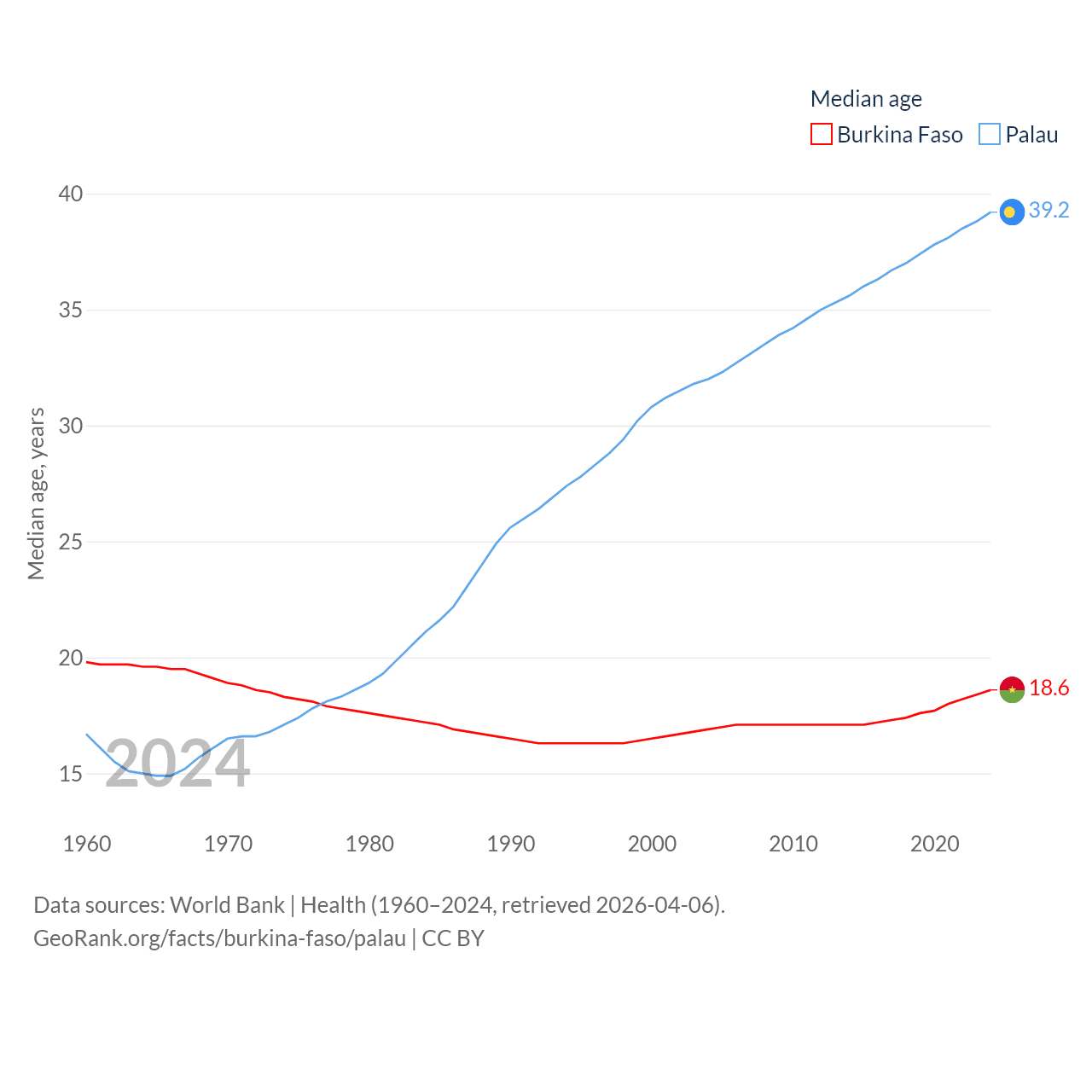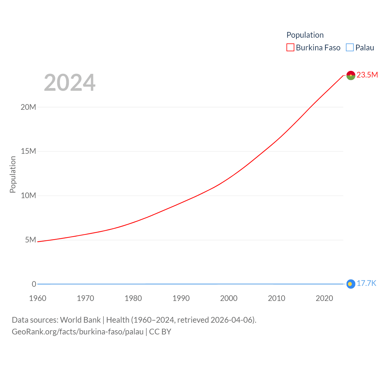 Burkina Faso has a population of 23.5M (ranked 59/197), compared with 17.7K in Palau (ranked 194/197). Burkina Faso's land area is 105,638 sq mi versus 177.6 sq mi for Palau (ranked 73rd vs. 180th).