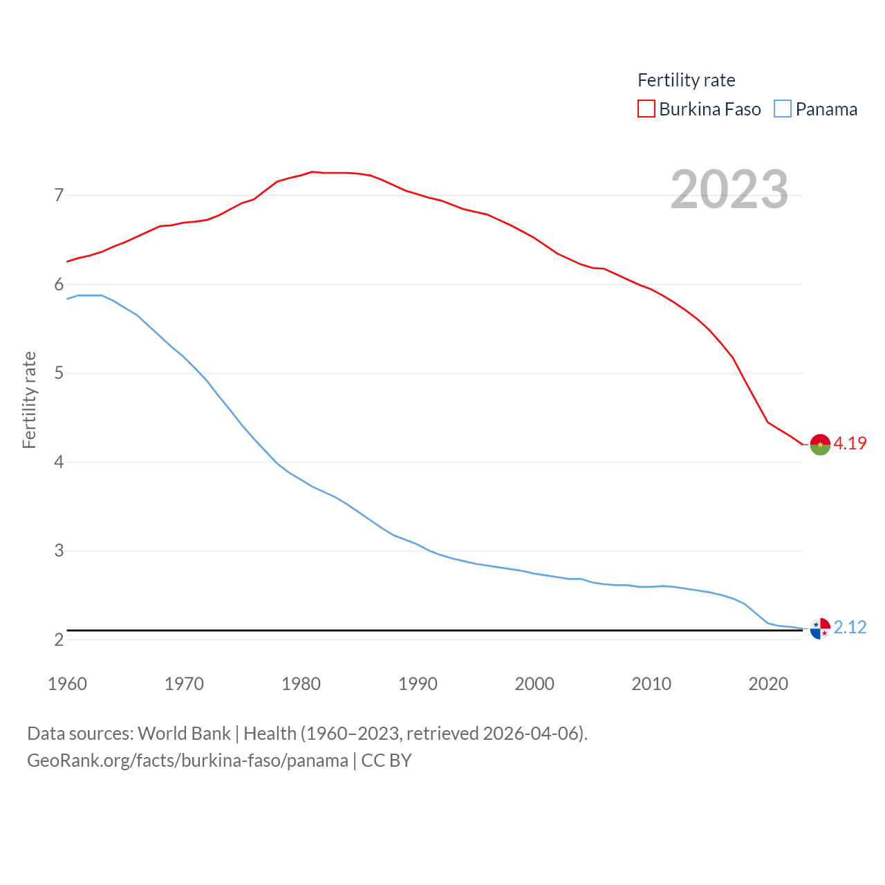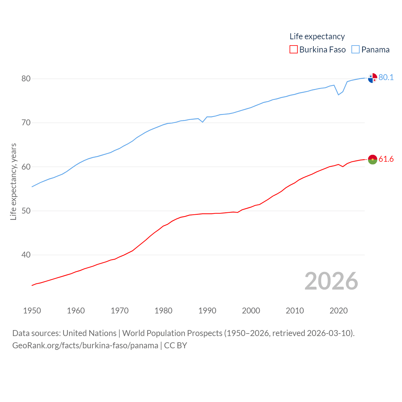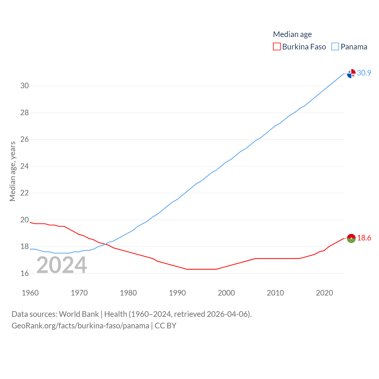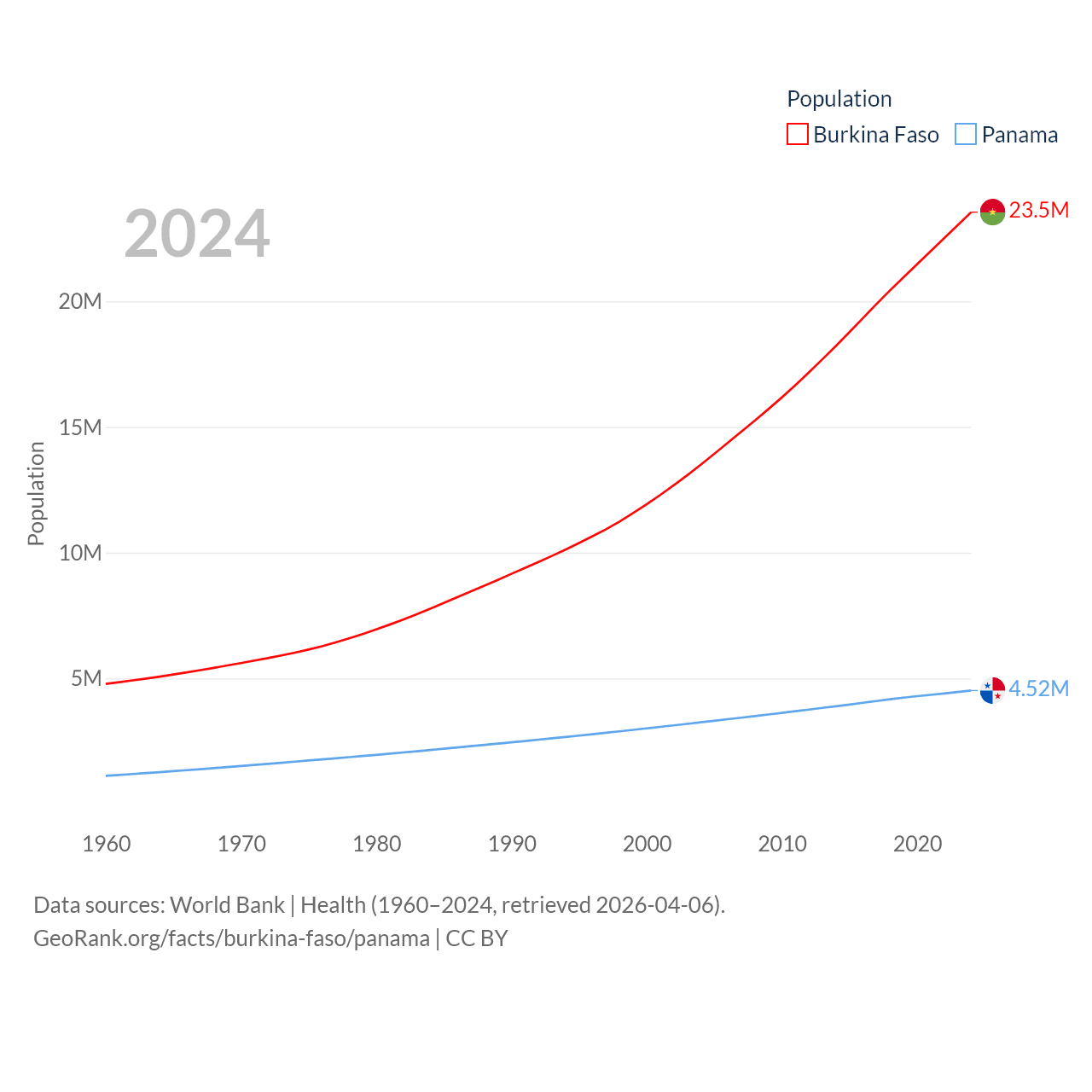 Burkina Faso has a population of 23.5M (ranked 59/197), compared with 4.52M in Panama (ranked 128/197). Burkina Faso's land area is 105,638 sq mi versus 28,641 sq mi for Panama (ranked 73rd vs. 115th).