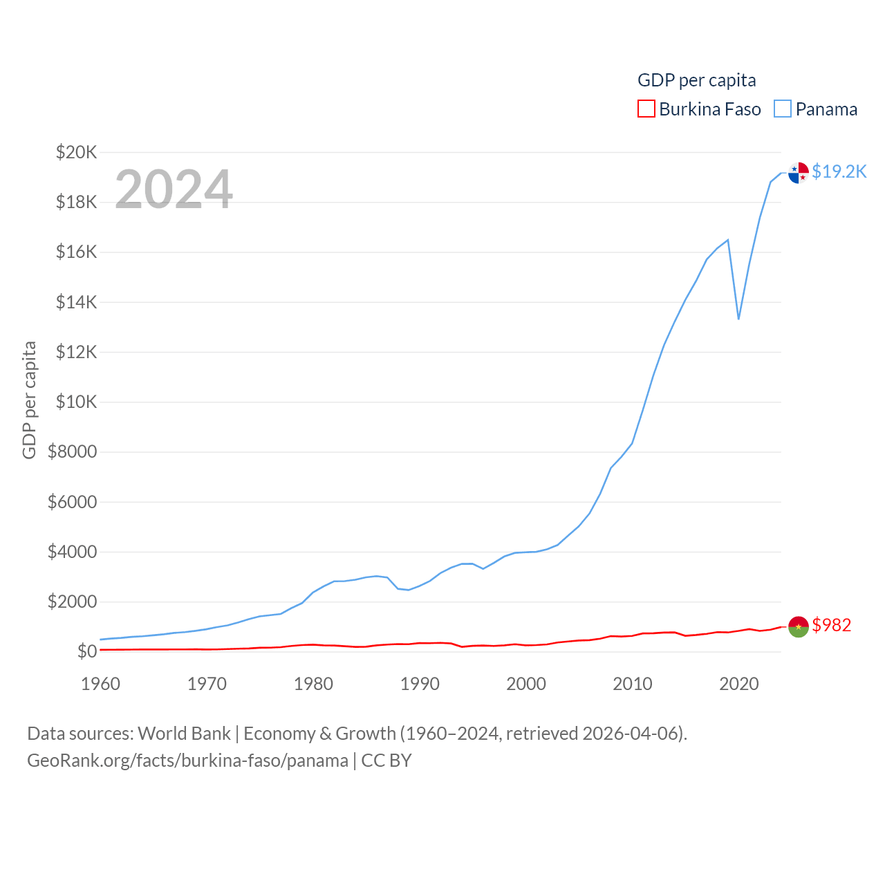 By GDP, Burkina Faso ranks 122/197 ($23.1B) and Panama ranks 78/197 ($86.5B). By GDP per capita, Burkina Faso ranks 180/197 ($982), while Panama ranks 60/197 ($19,161).